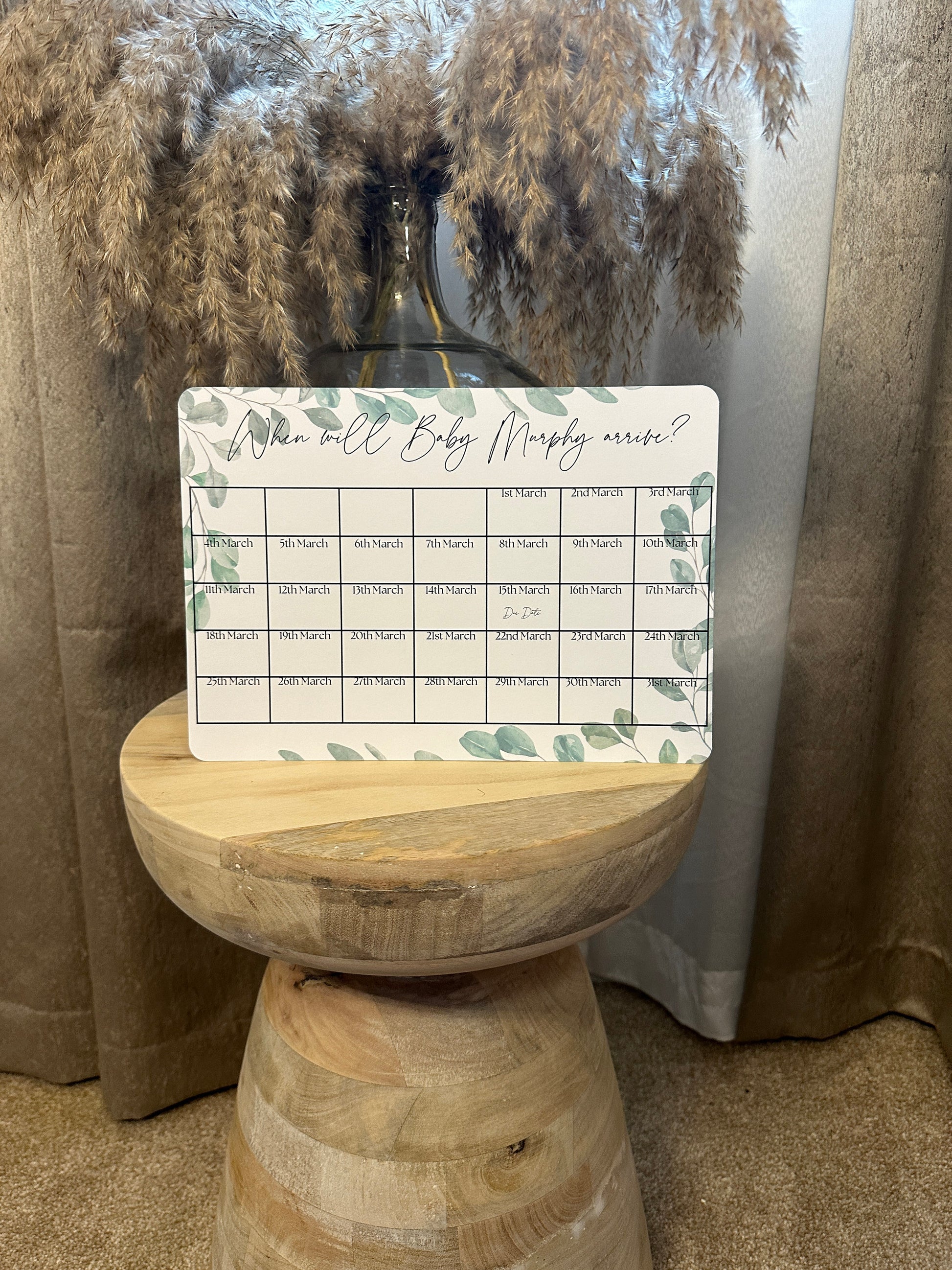 Please add your due date in the personalisation box below and we will add 2 weeks either side of the date so guests can guess when they think the baby will arrive.