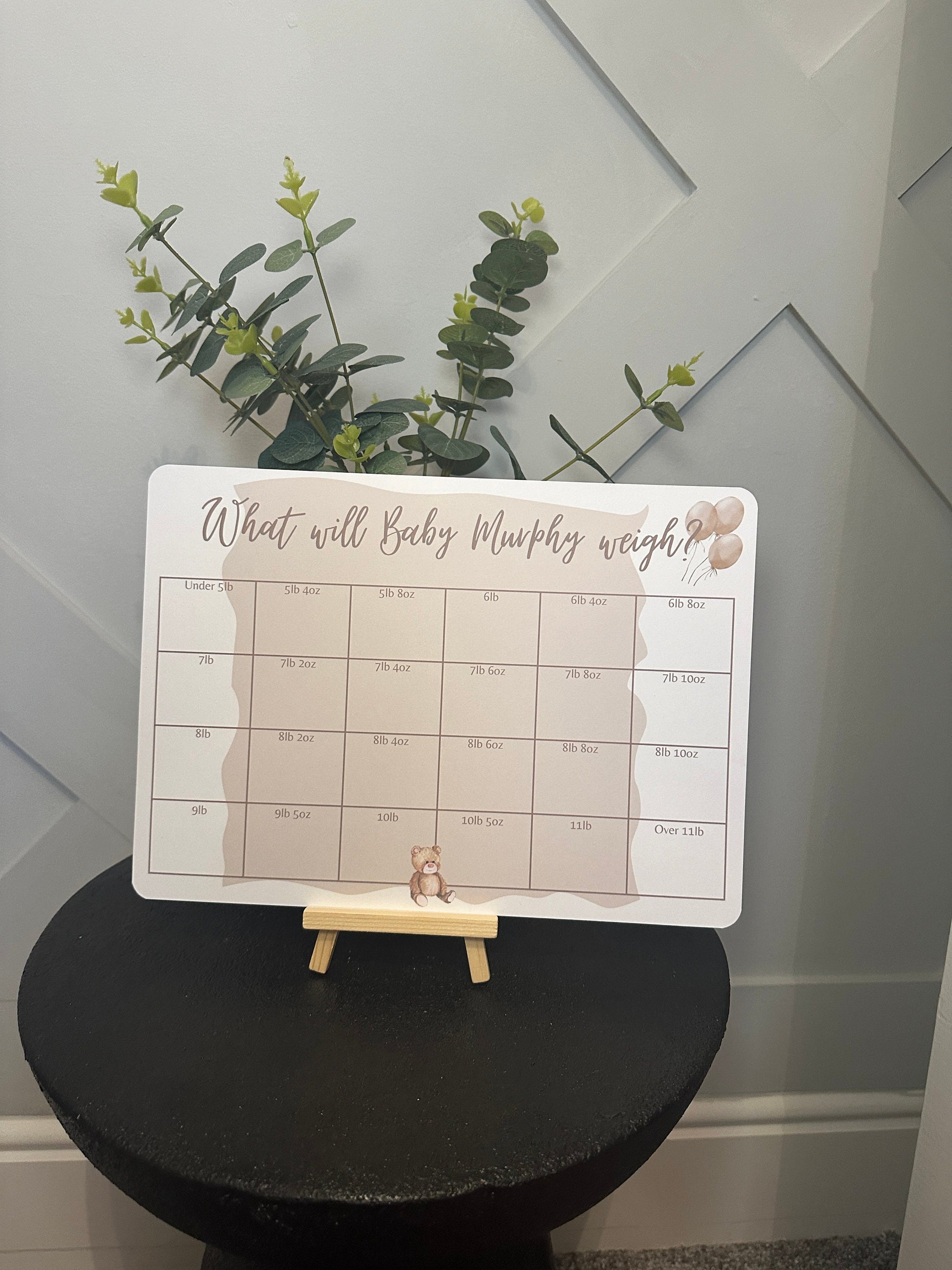 Guests either need to write the weight they think the baby will be in the box with their name in or write their name in the box of the weight they think the baby will be.