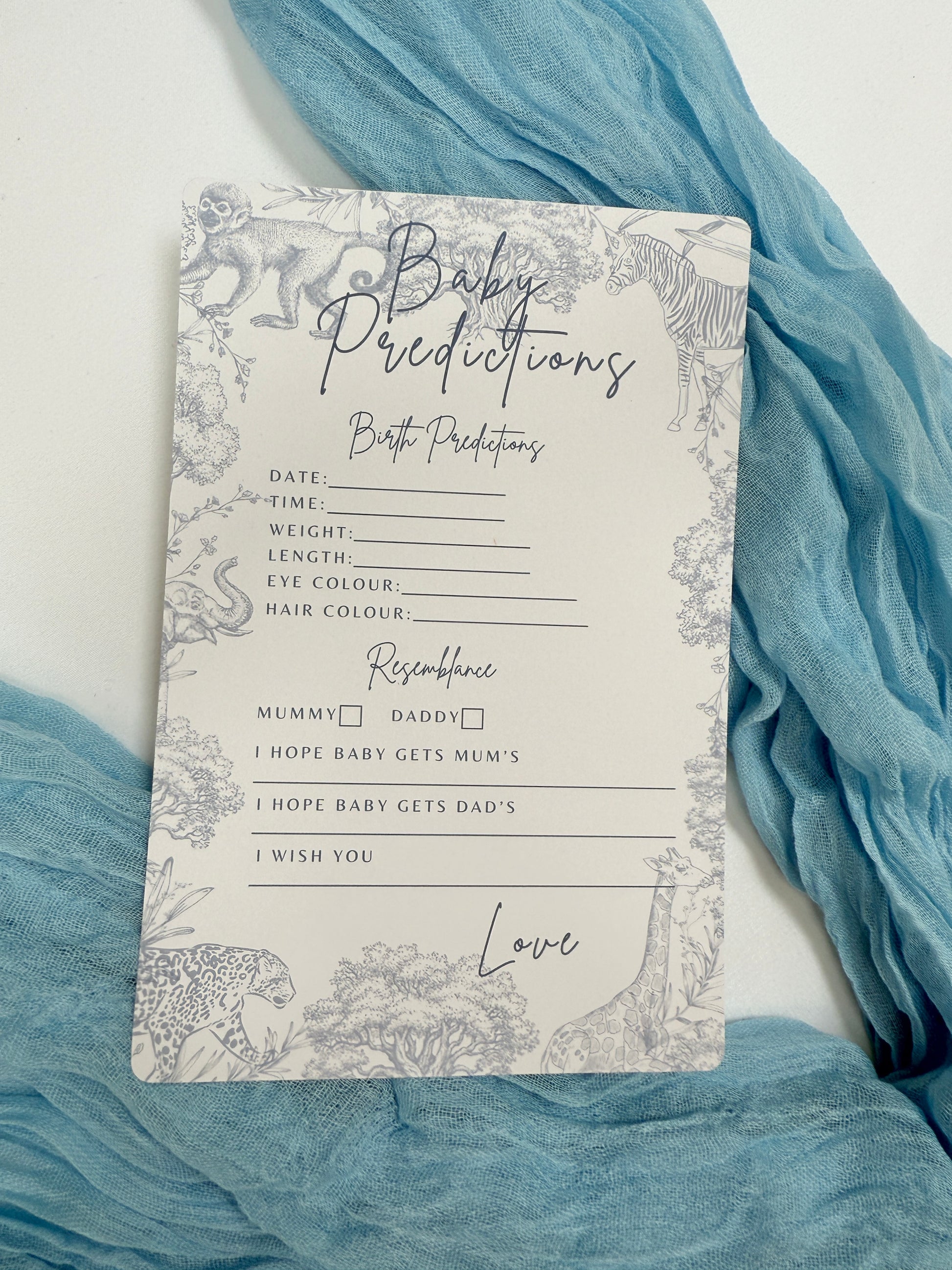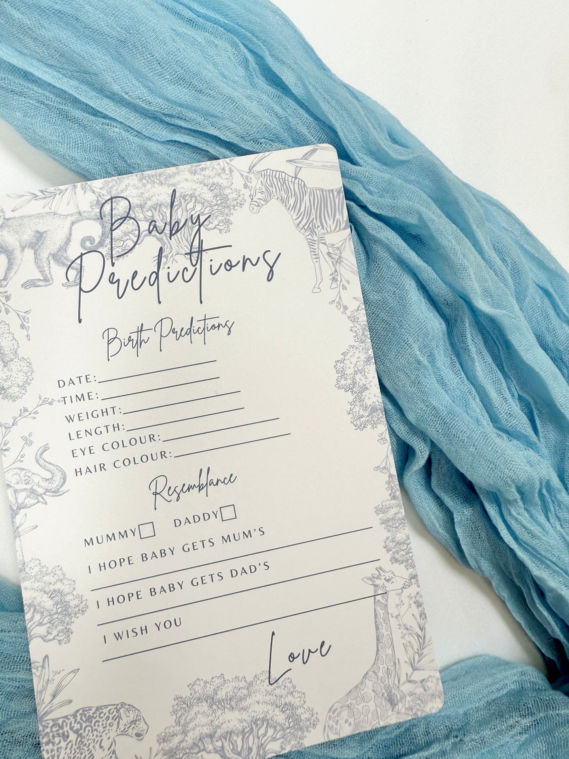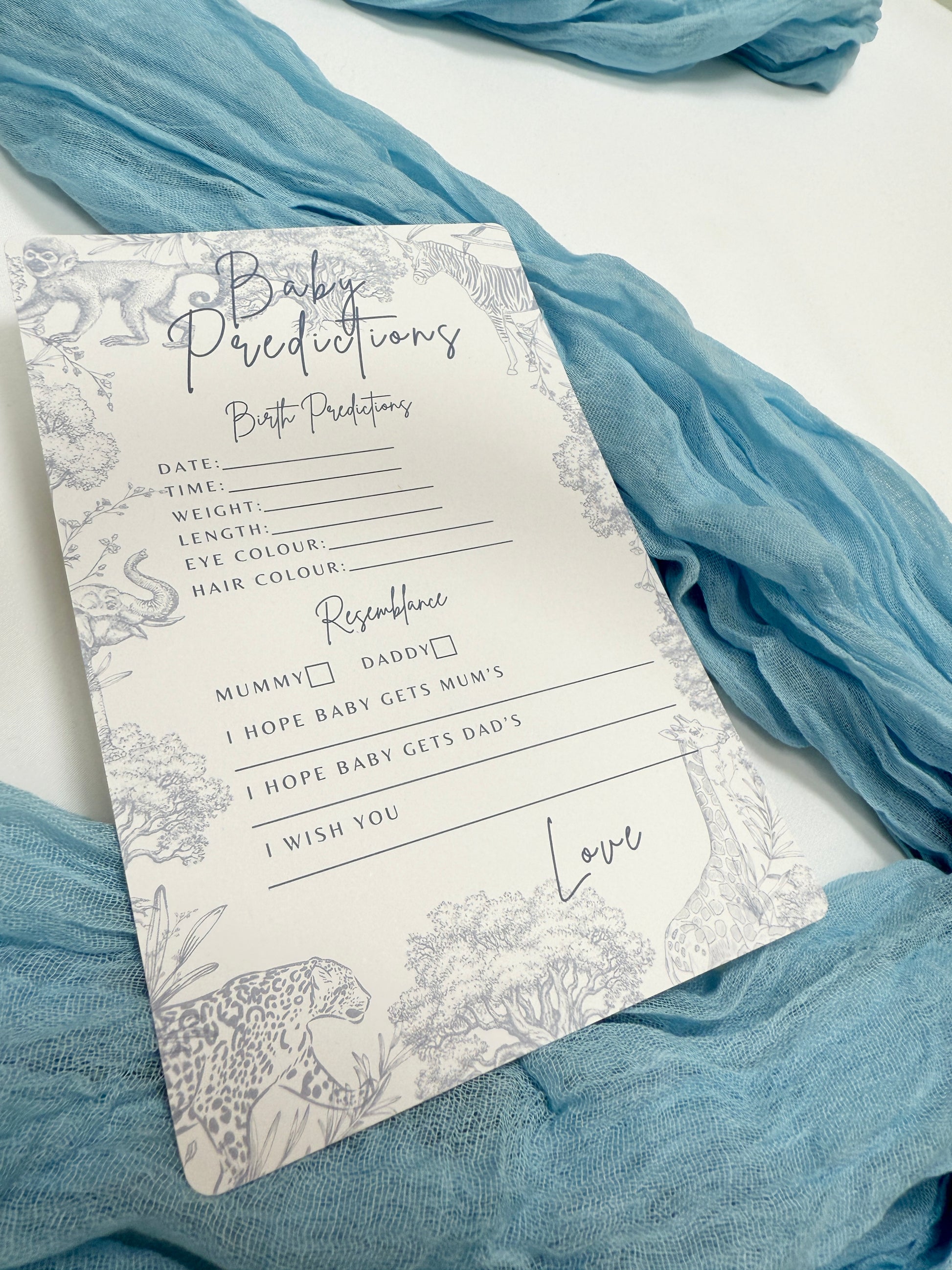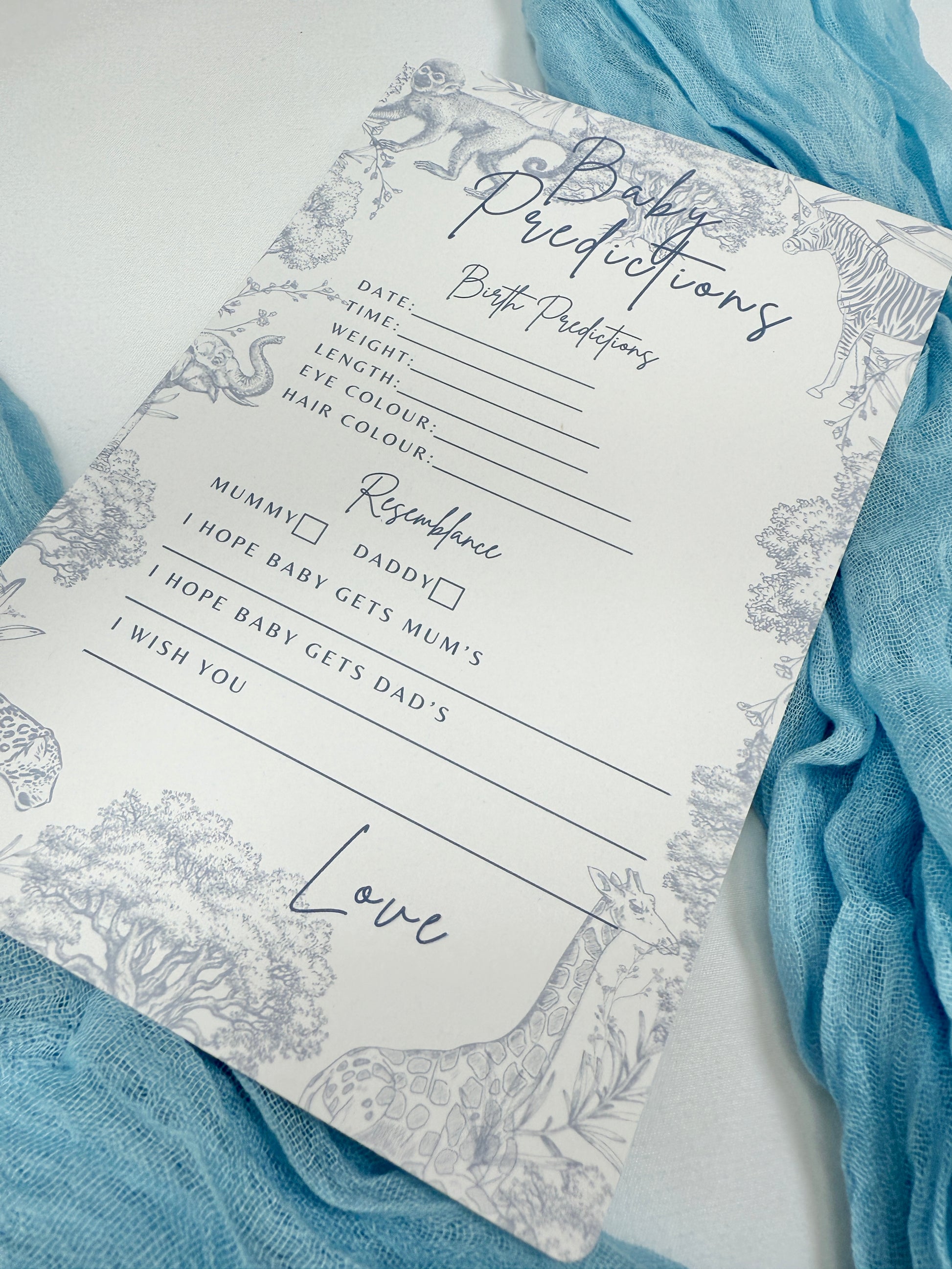 Blue Safari Themed Baby Prediction Cards.