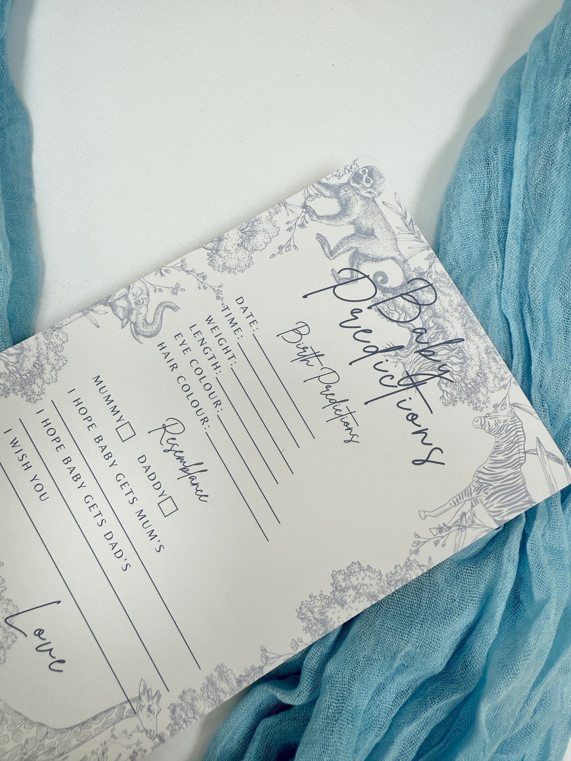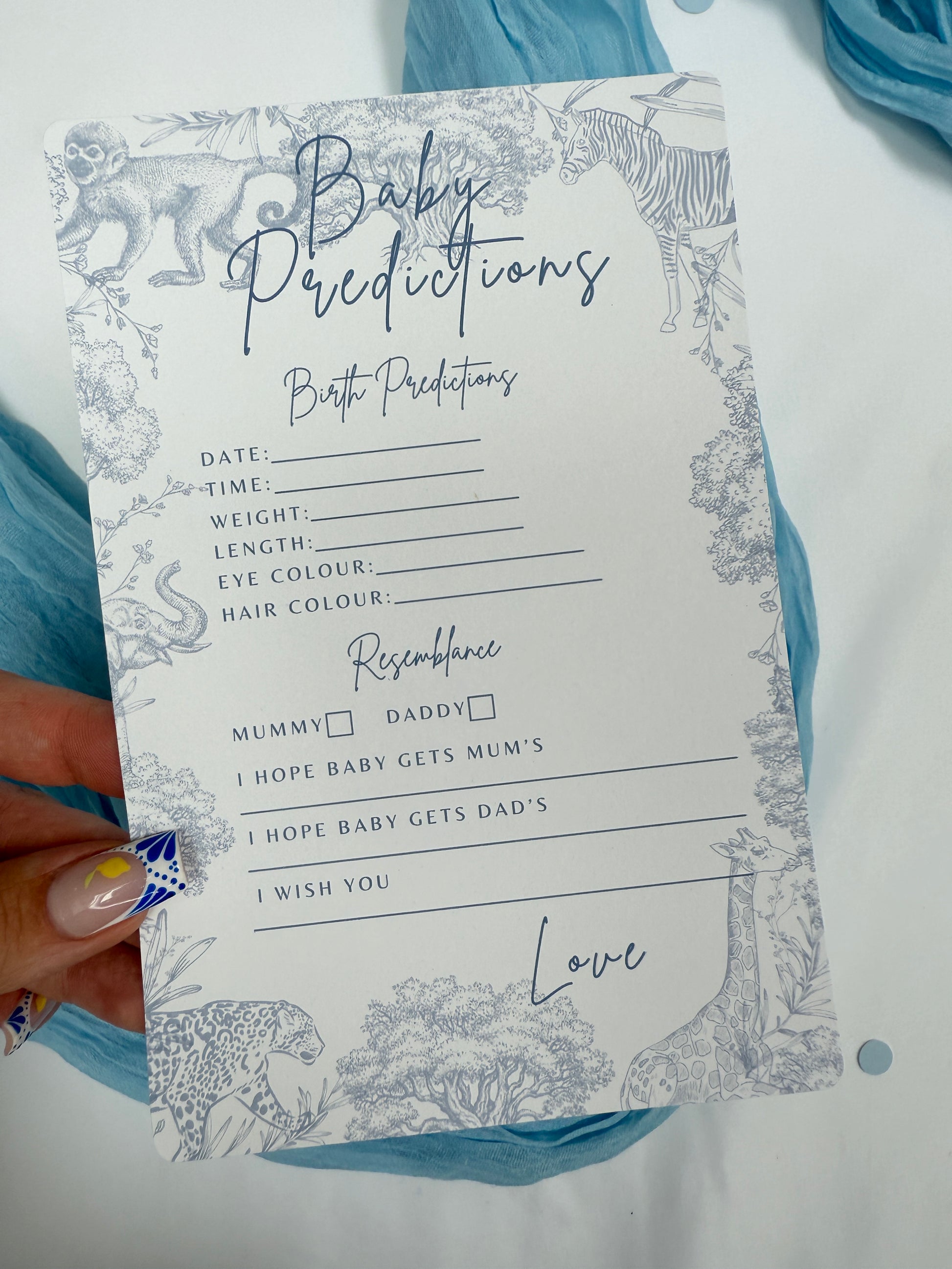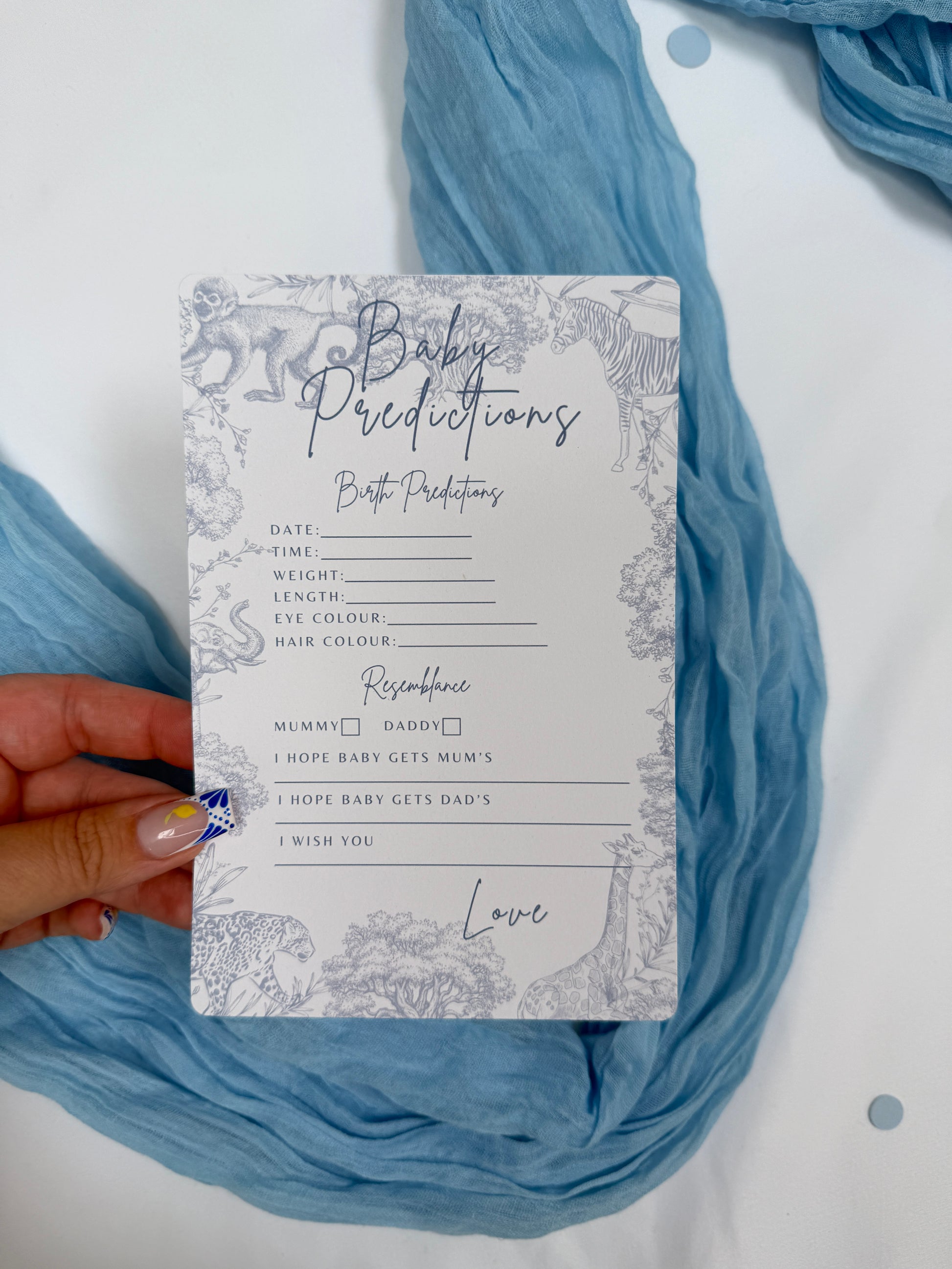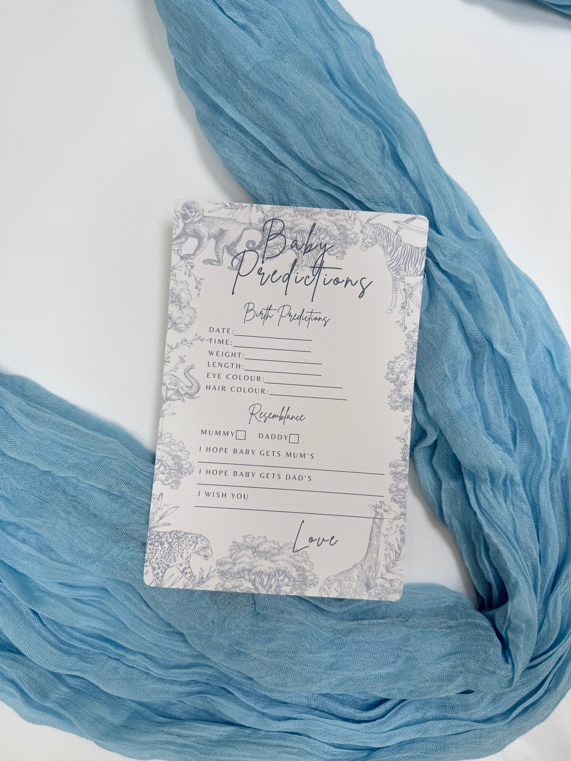 Blue Safari Themed Baby Prediction Cards.