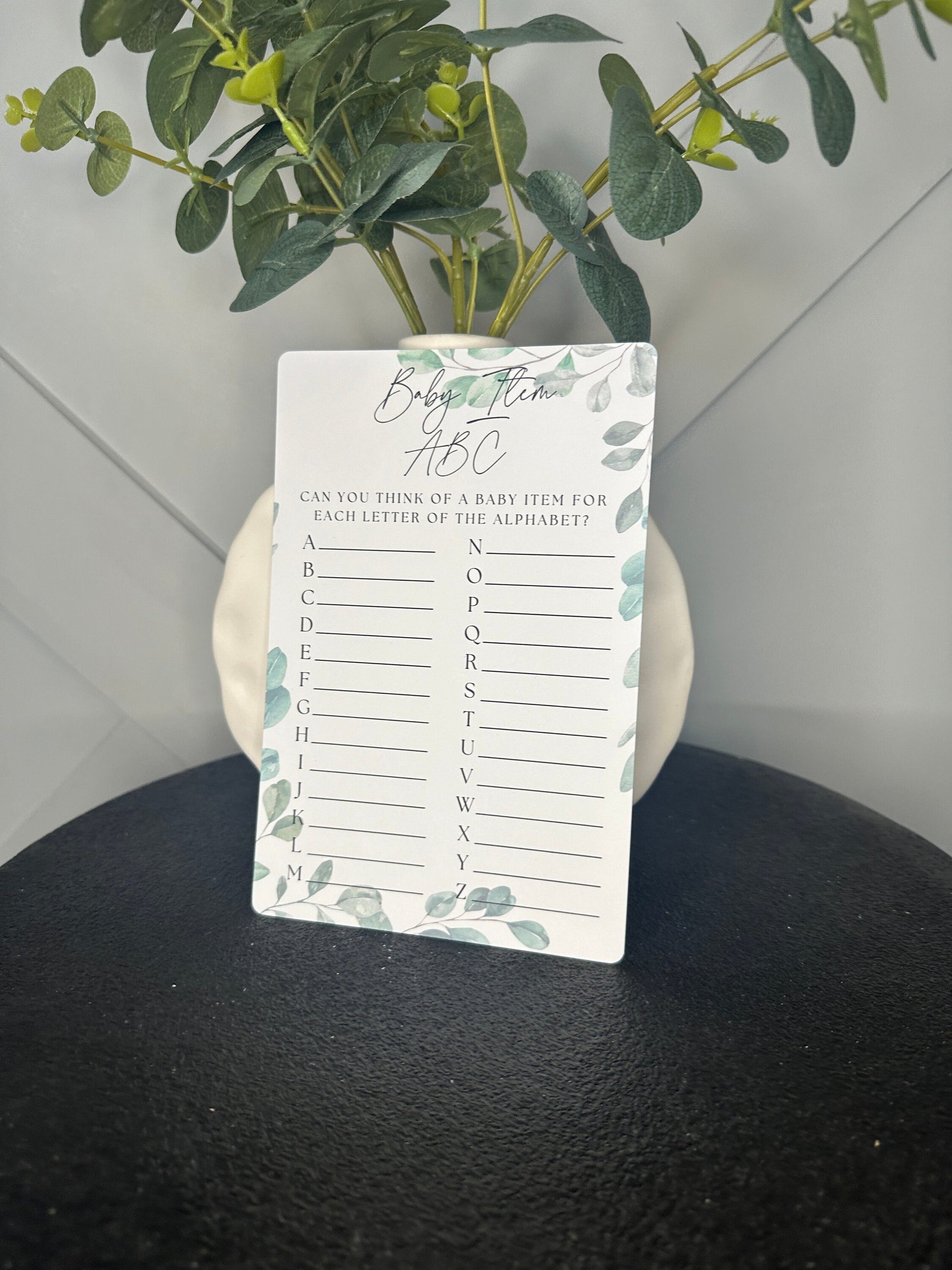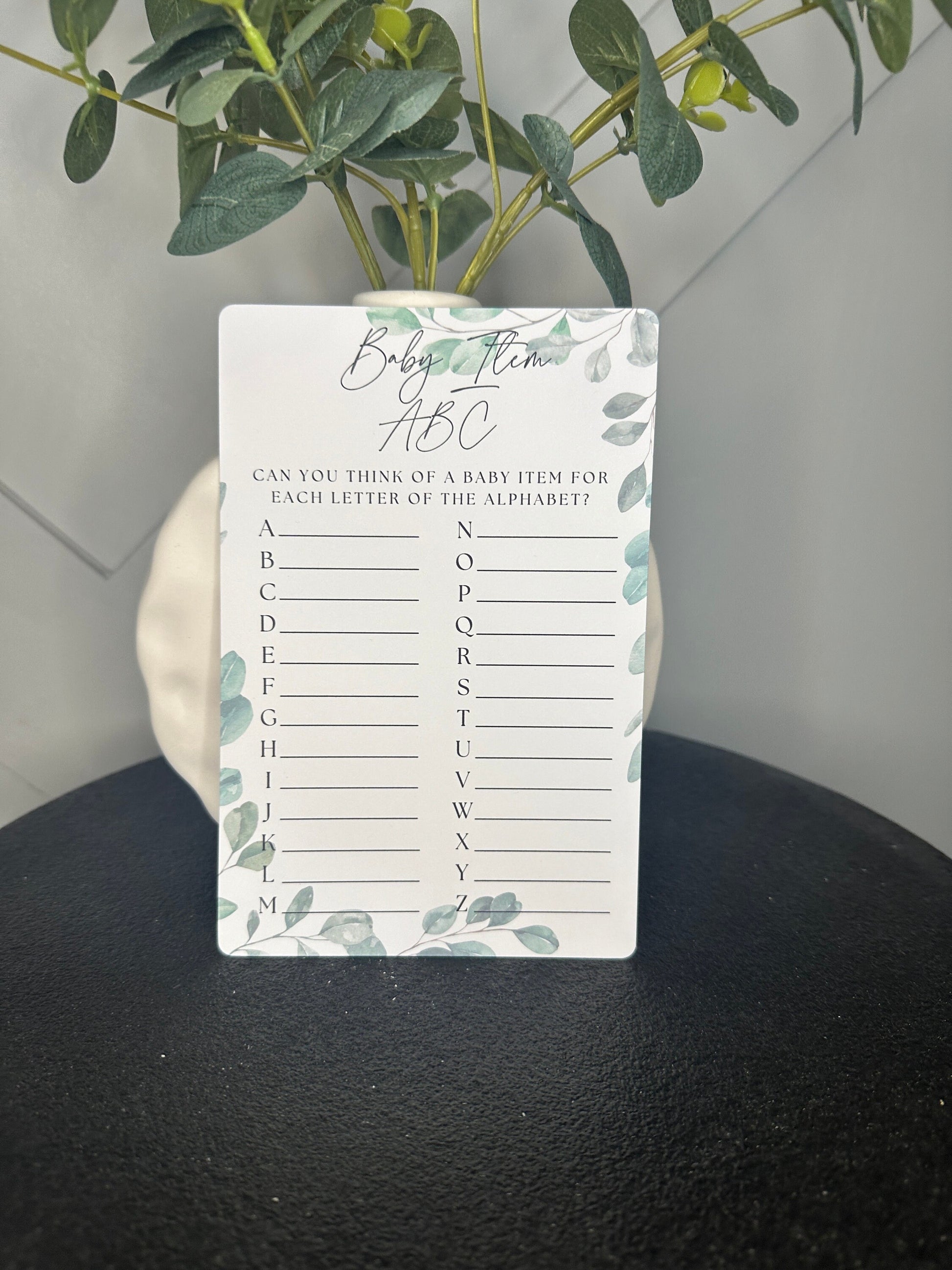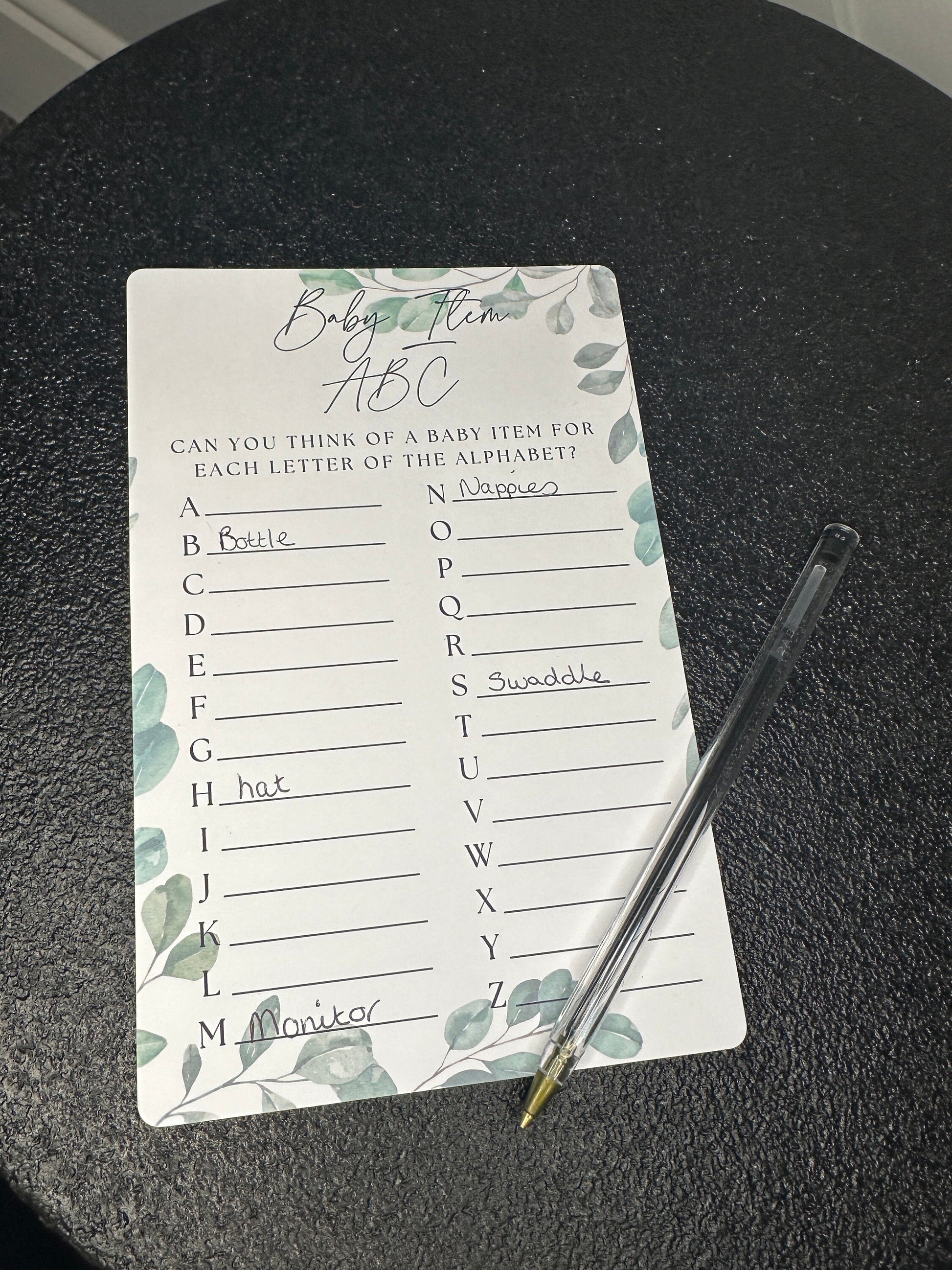 Guests need to write down a baby item for every letter of the alphabet next to each letter.