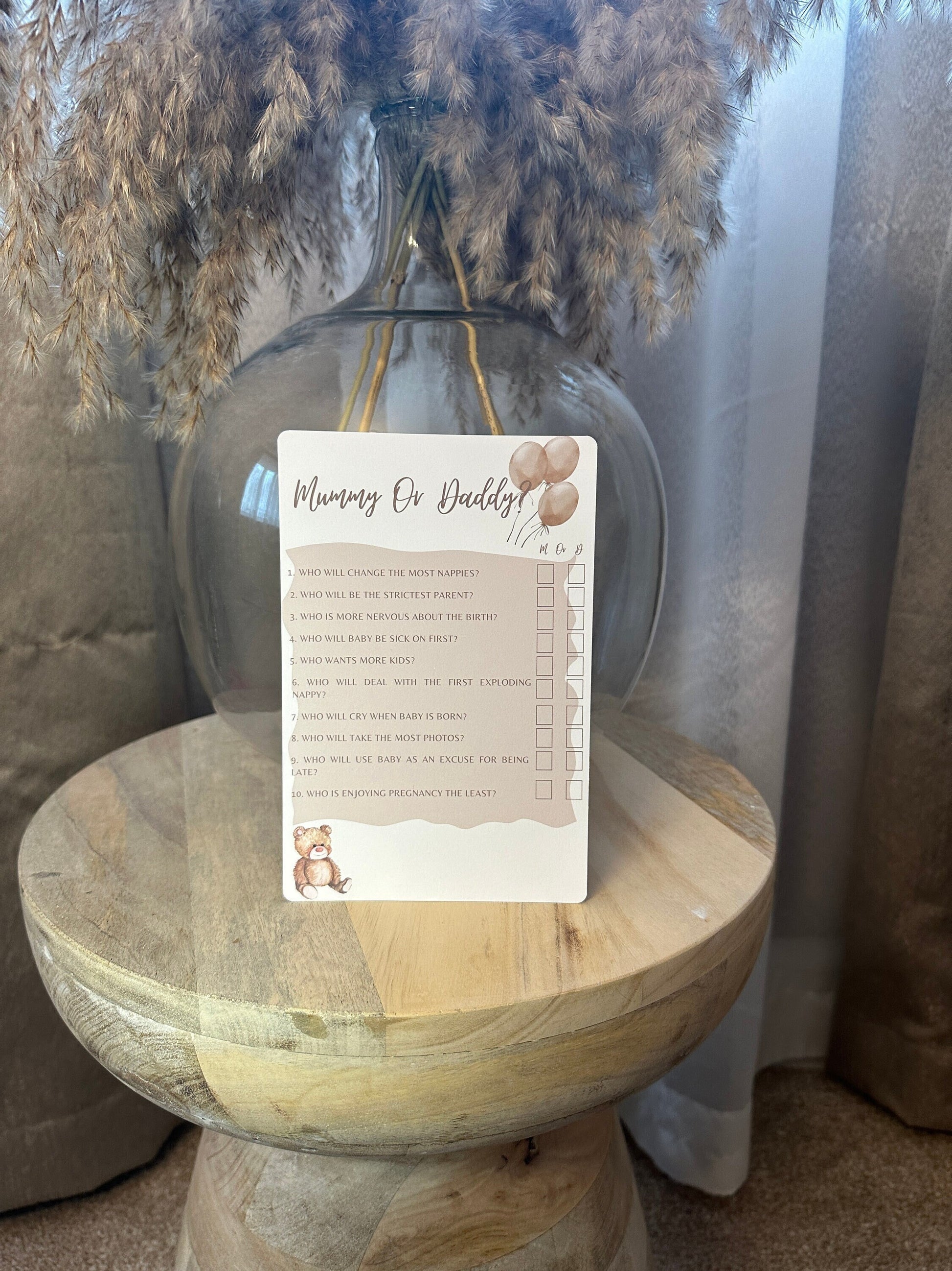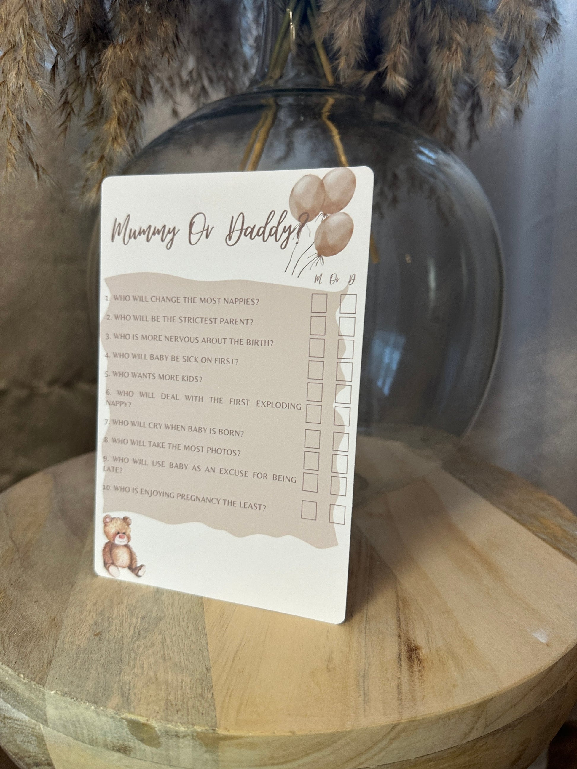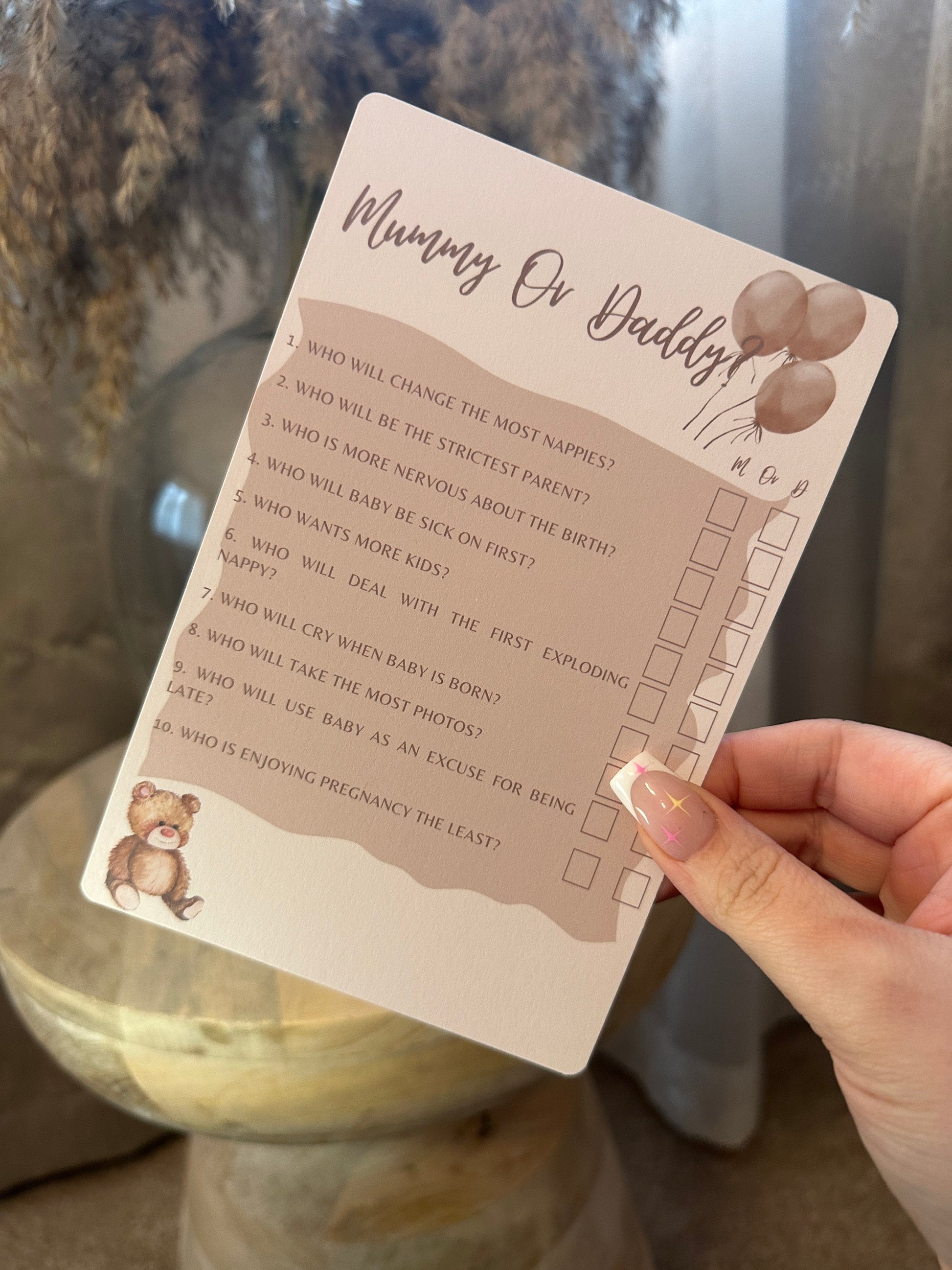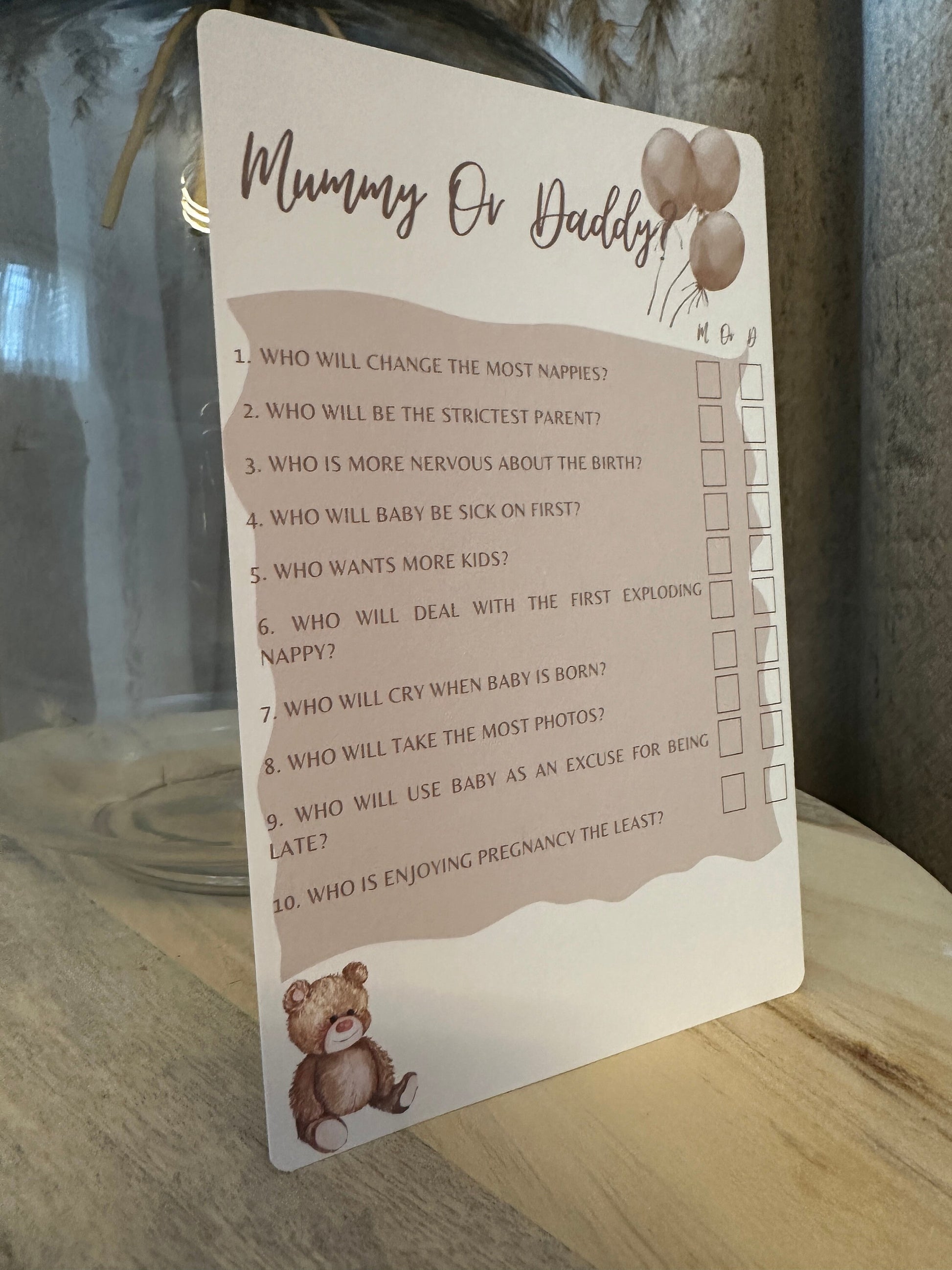 Either the guests can fill out the cards answering who they think out of mummy or daddy is most likely to do certain things and the host can read out the answers to the mum and dad.