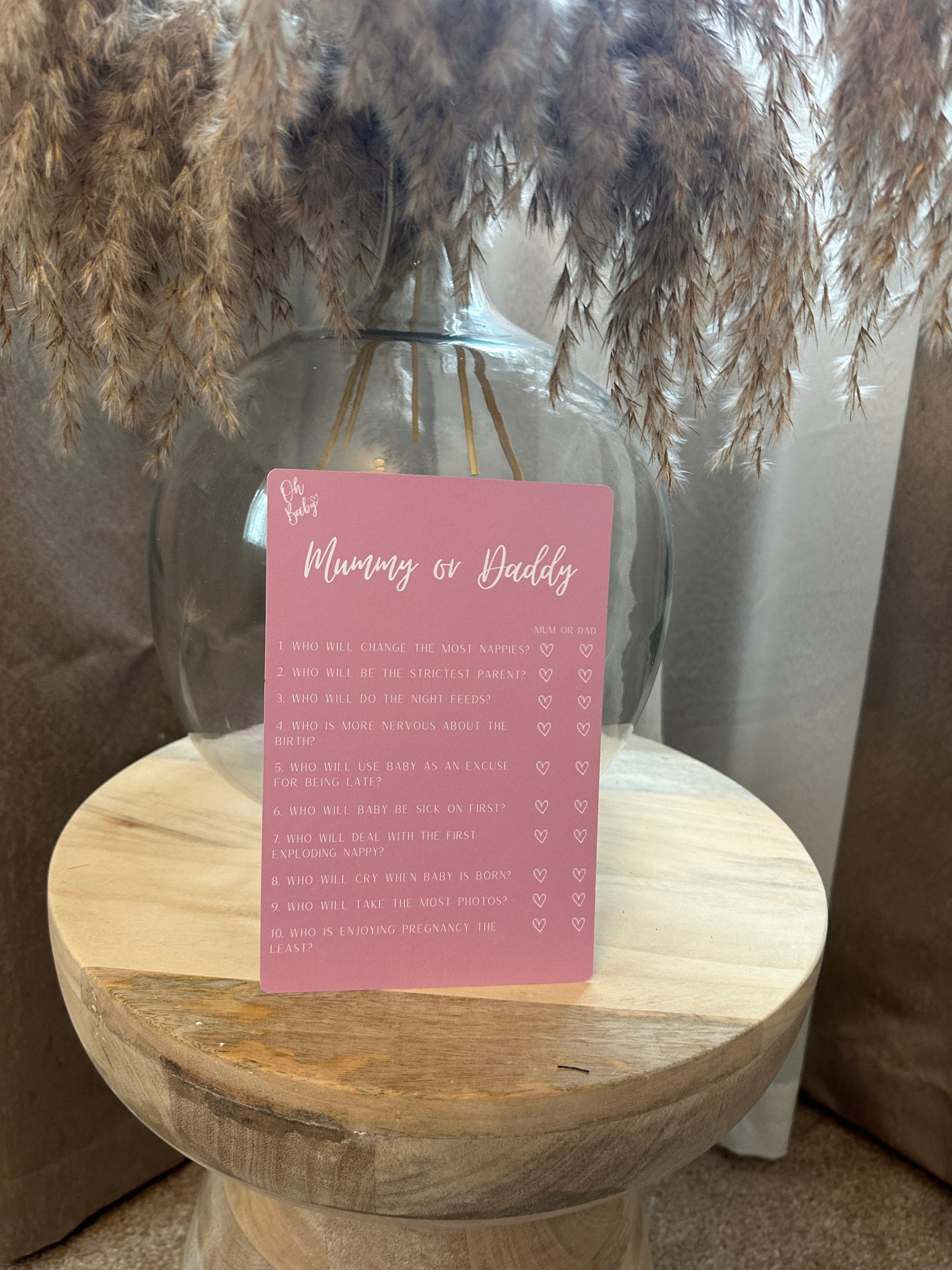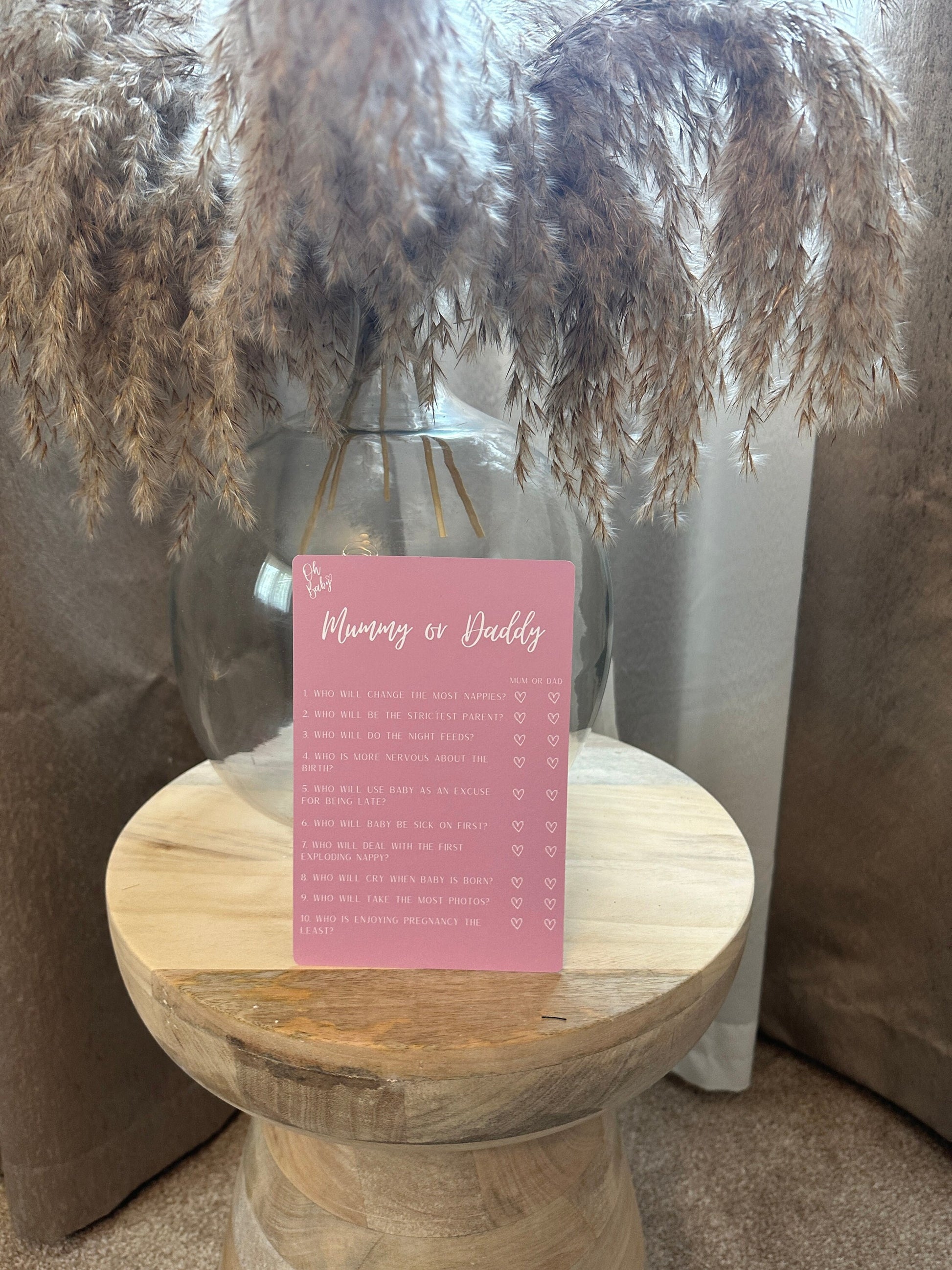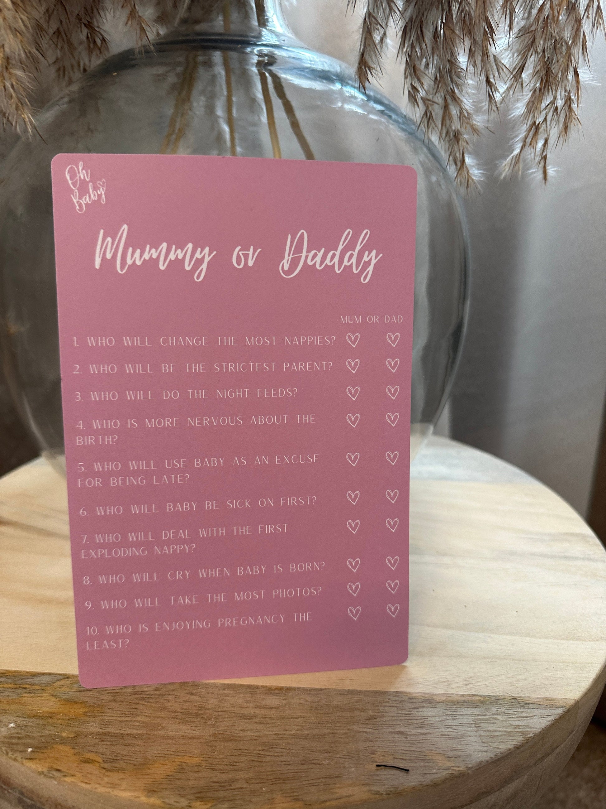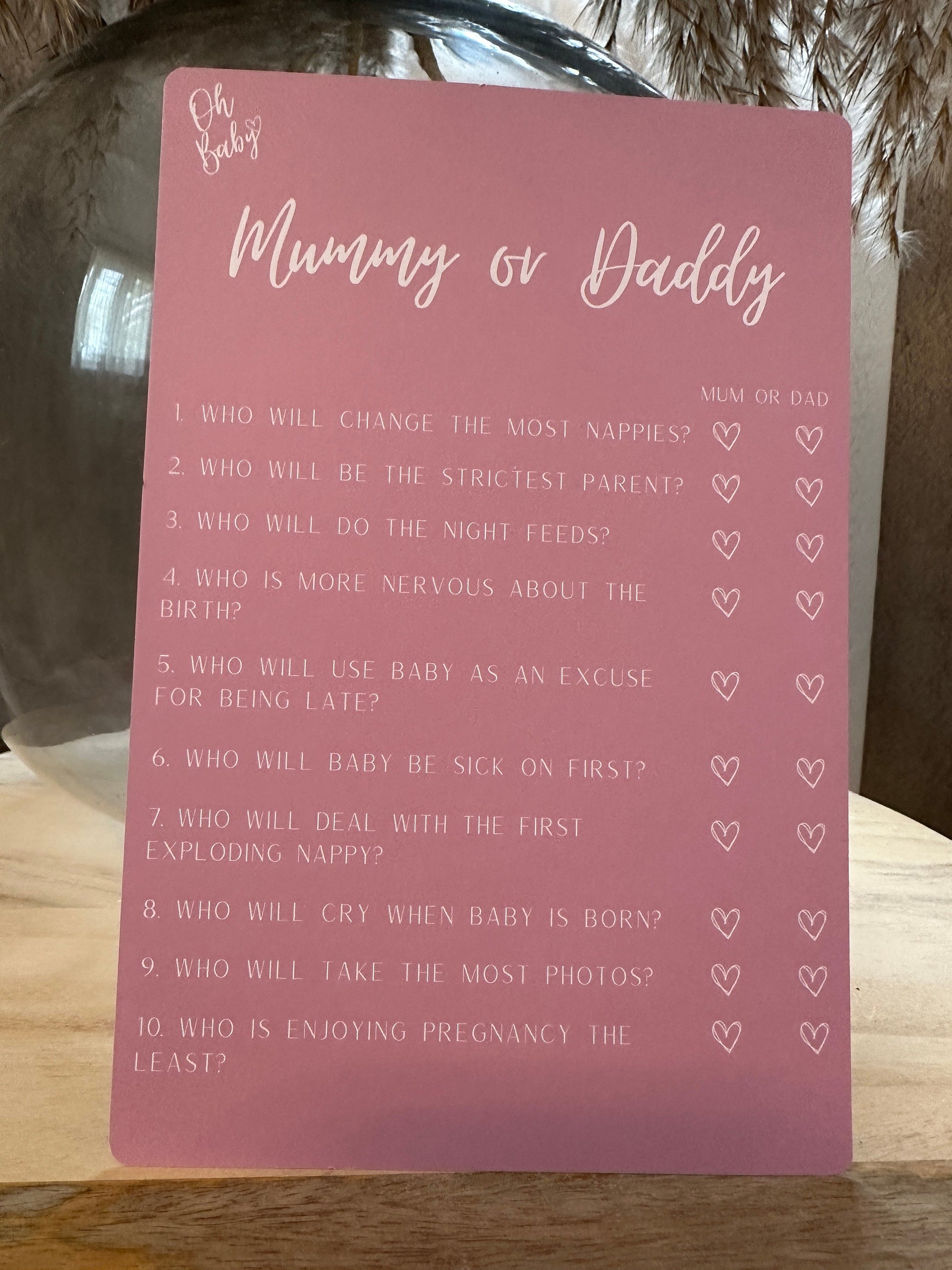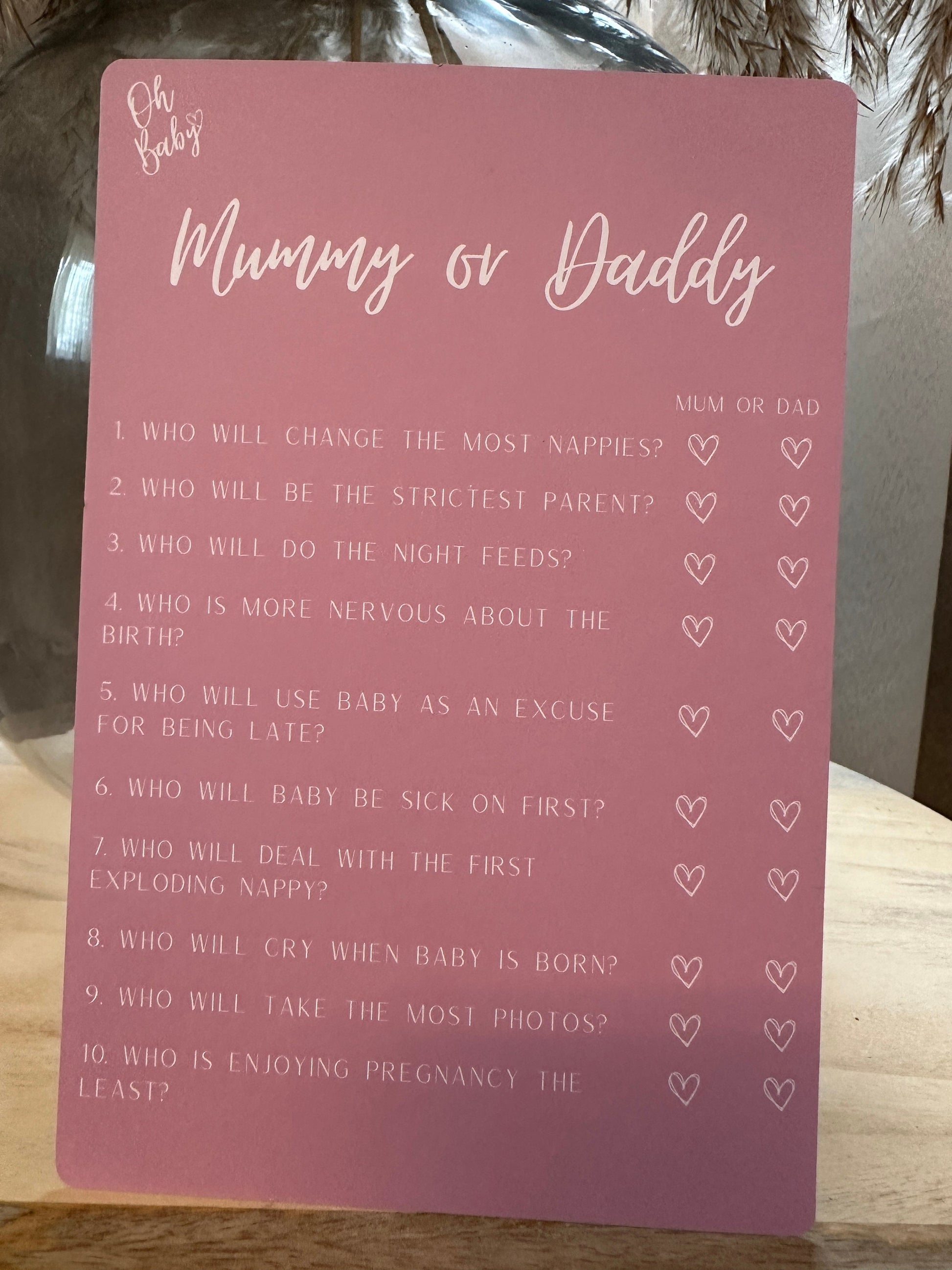 Either the guests can fill out the cards answering who they think out of mummy or daddy is most likely to do certain things and the host can read out the answers to the mum and dad.