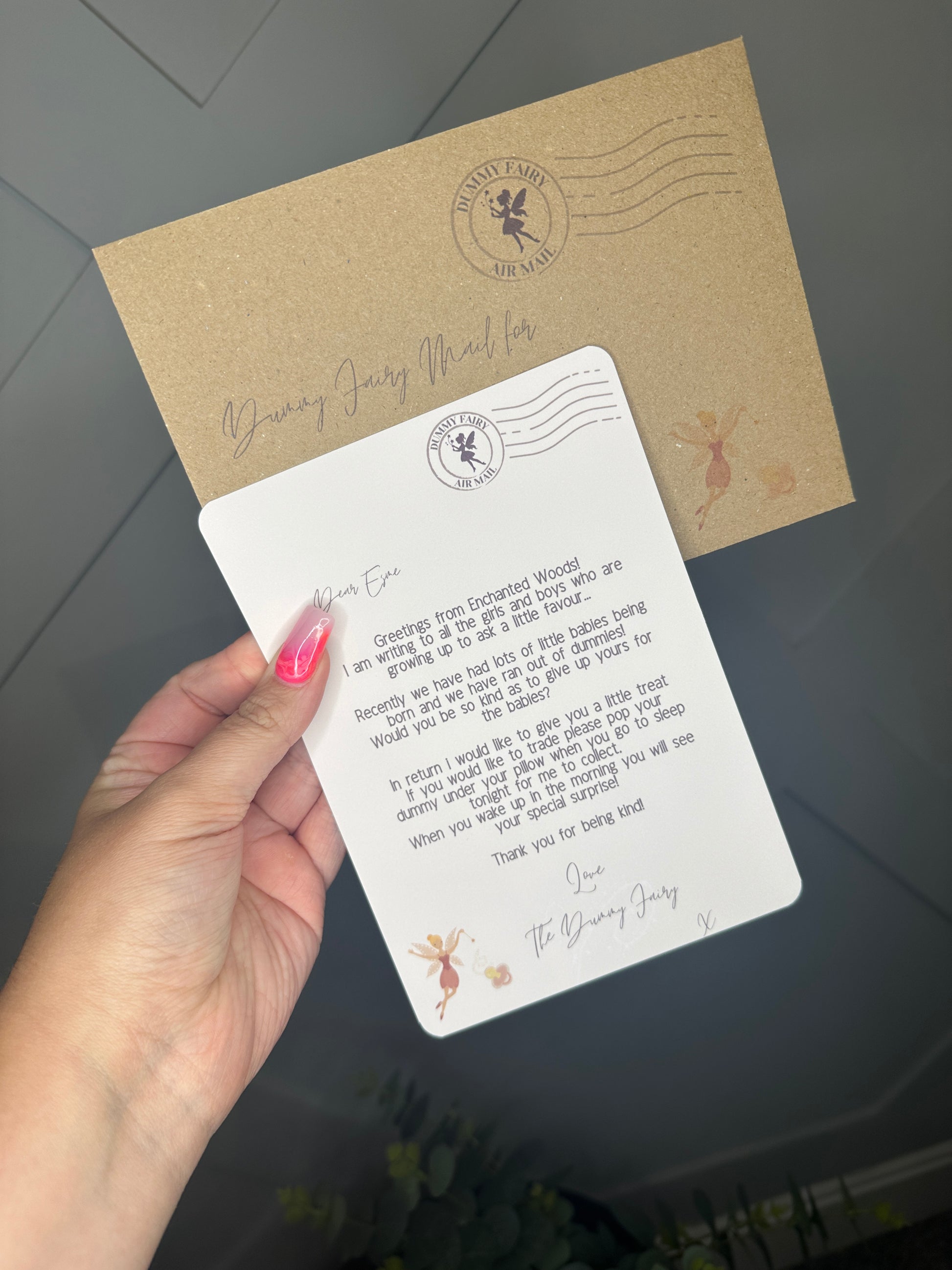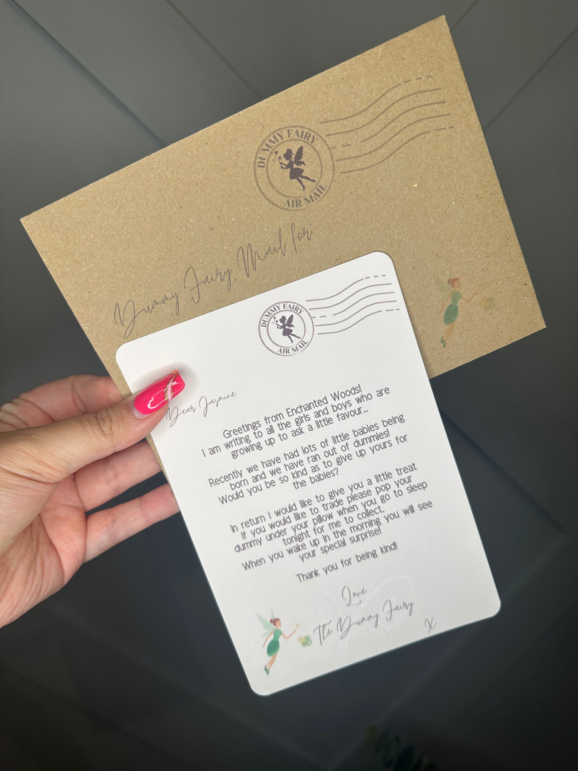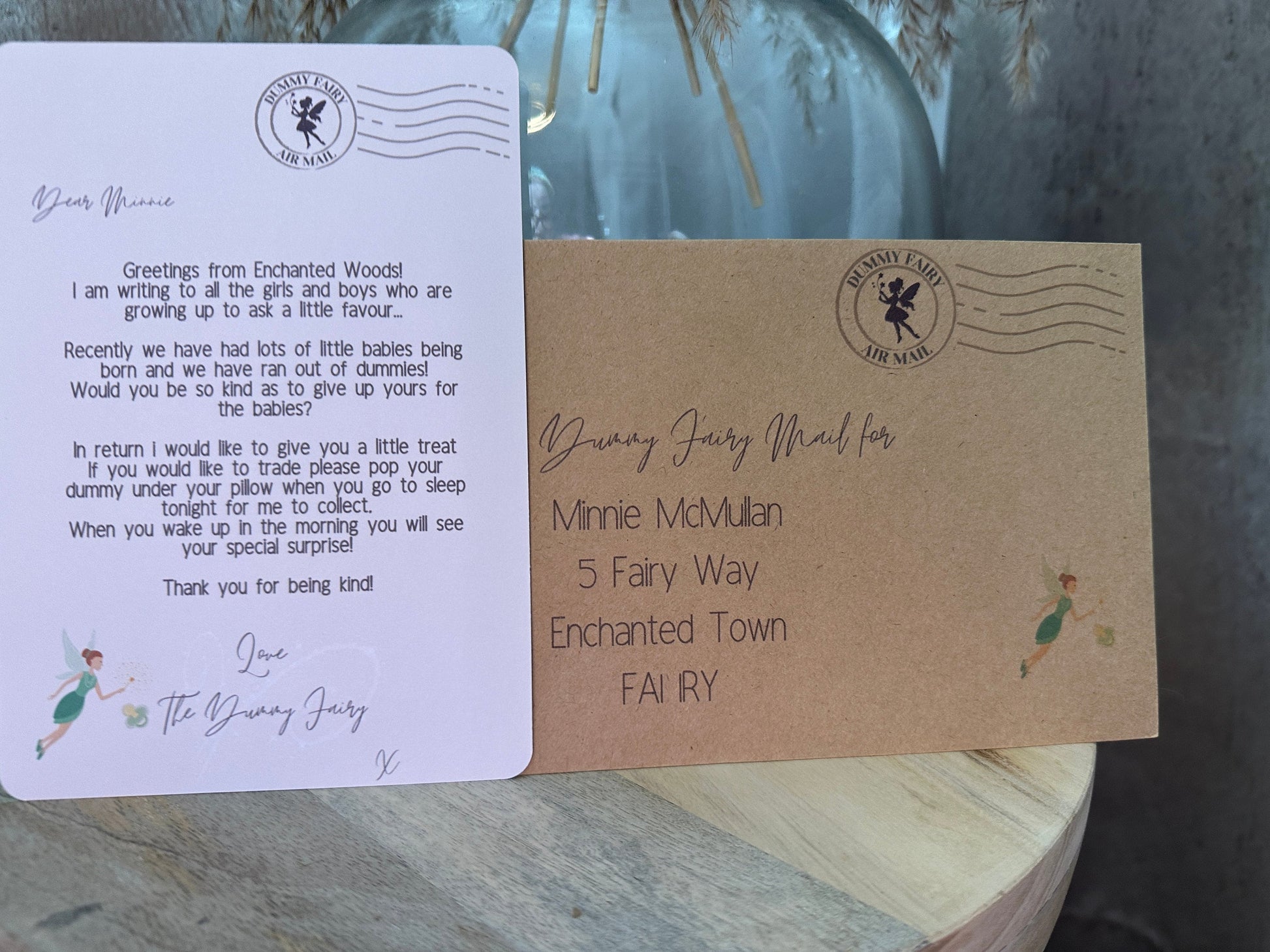 Personalised with the Childs name and address on the envelope so it looks like its come from the Dummy Fairy.
