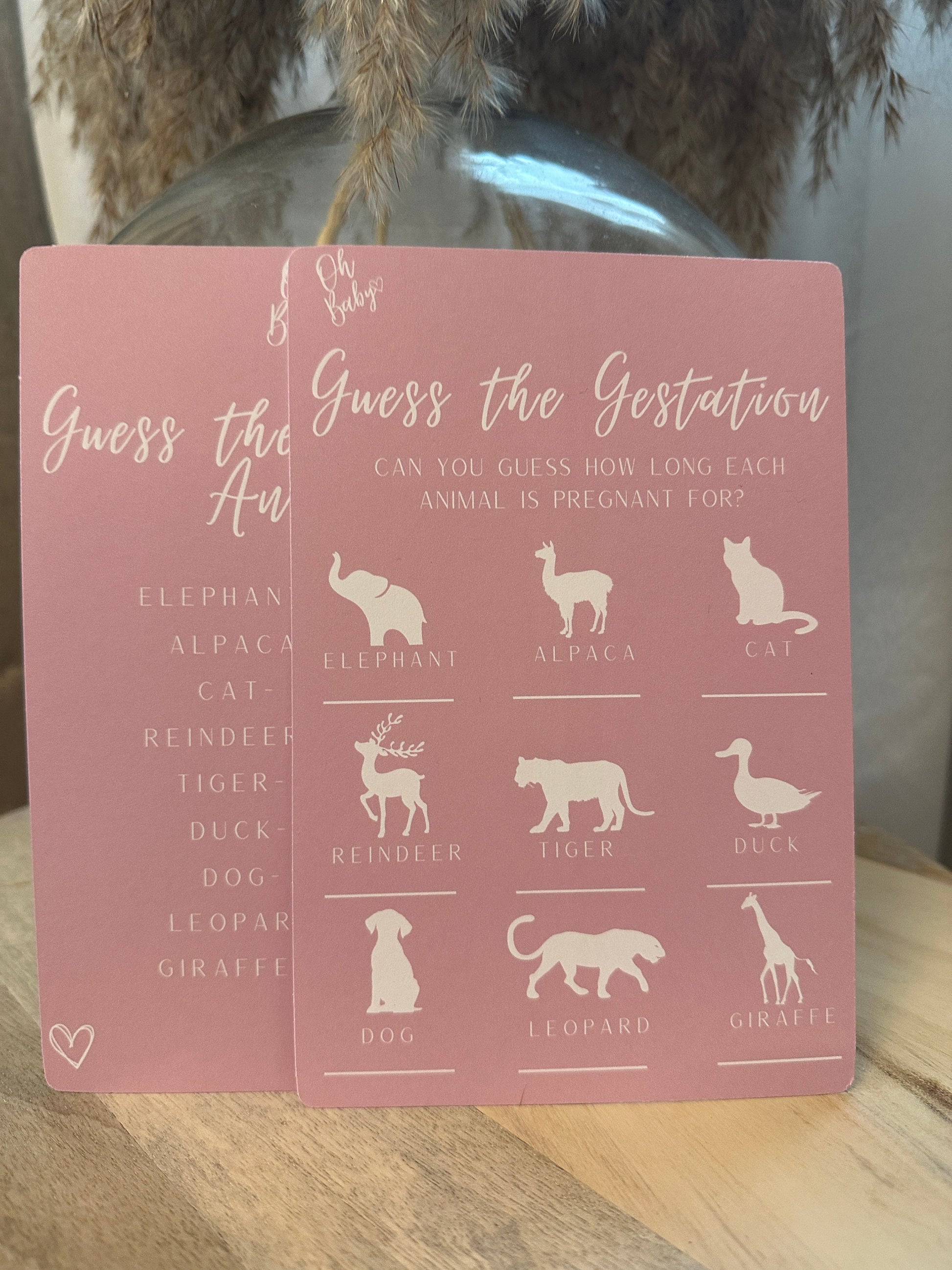 Guests can write down their predictions for the new baby such as weight, hair colour and time of birth. There is space for guests to sign their name at the bottom. These cards can be used as a competition for when the baby has been born or it can be kept as a keepsake for the mum to be.