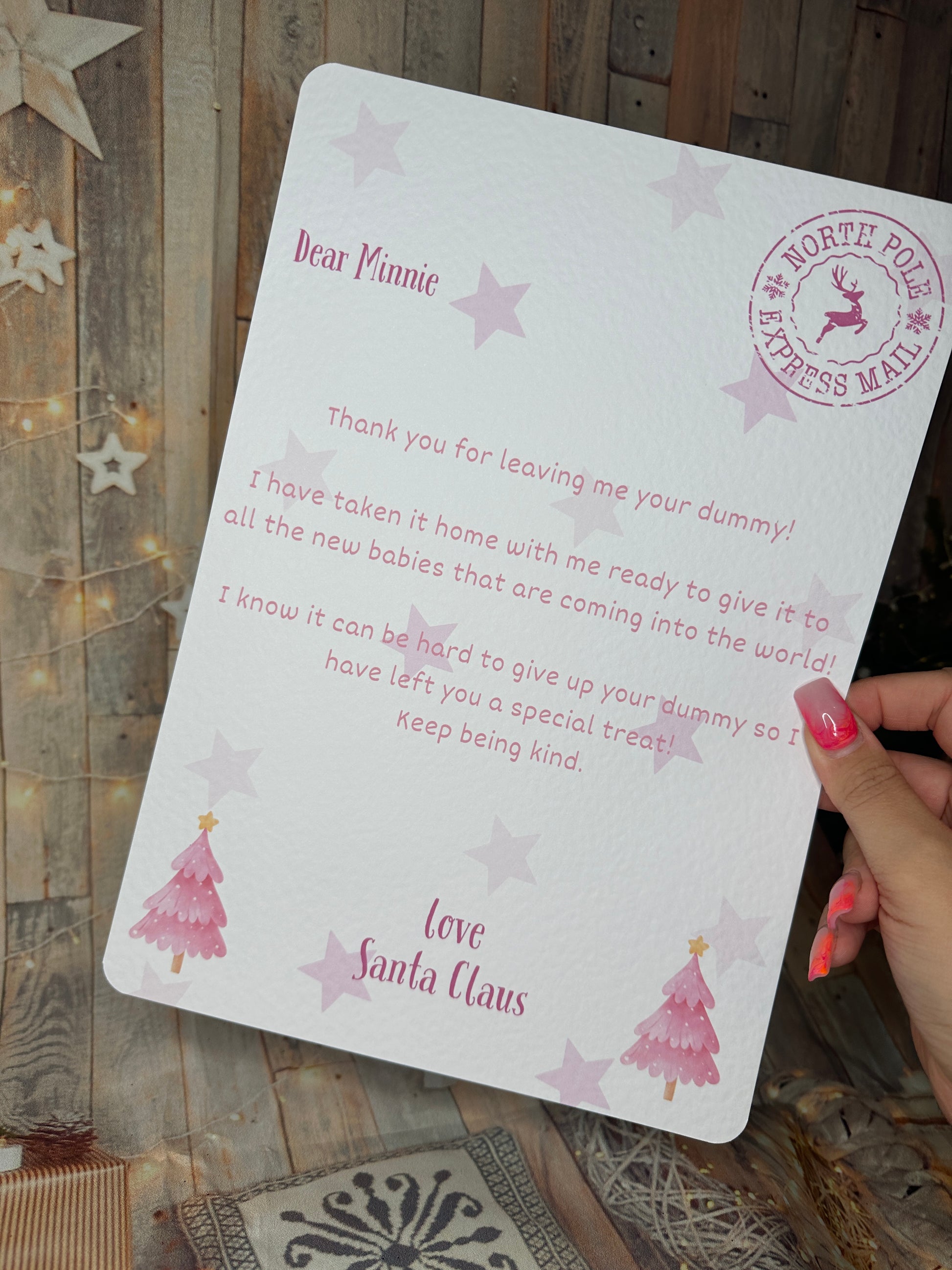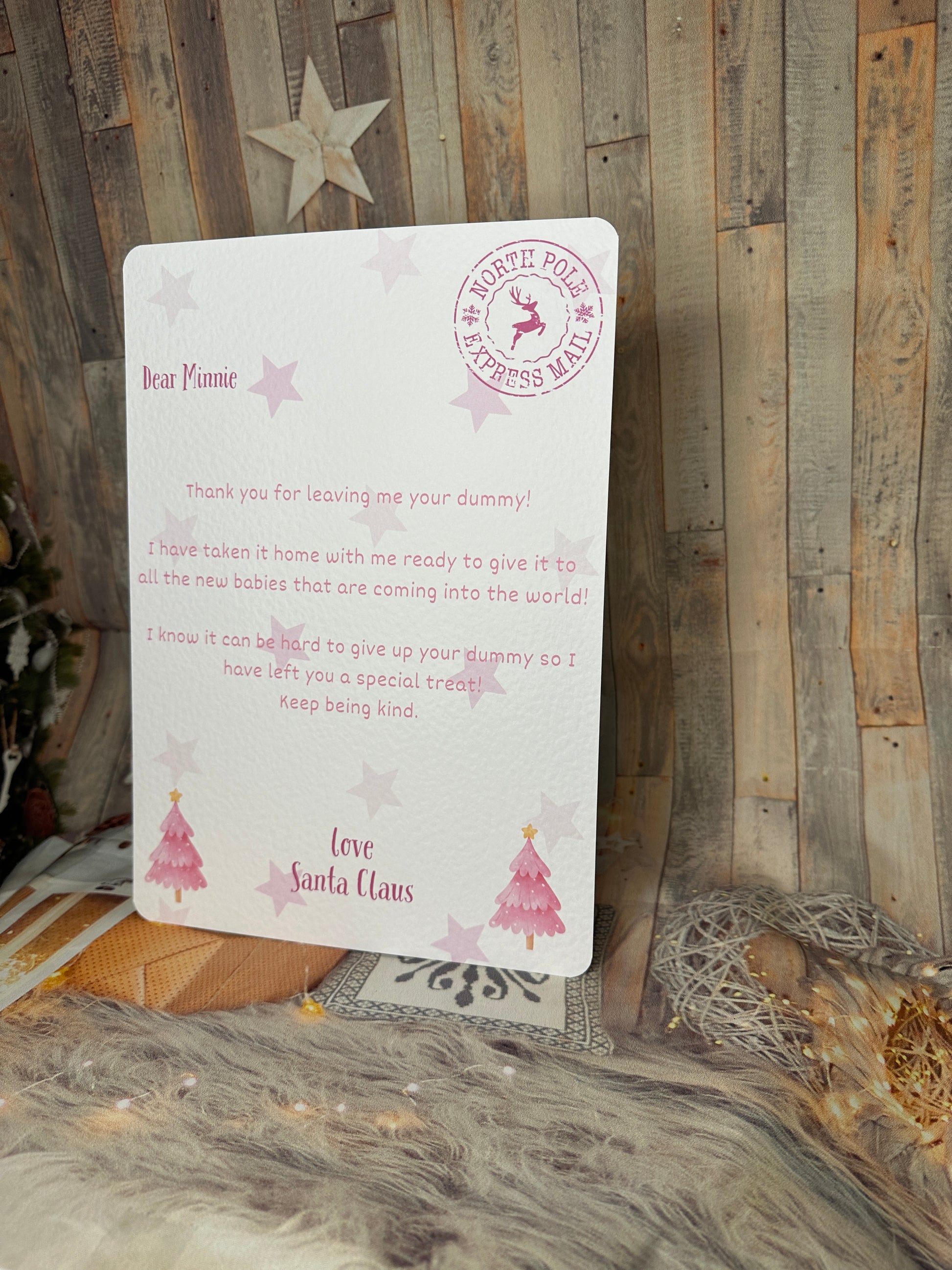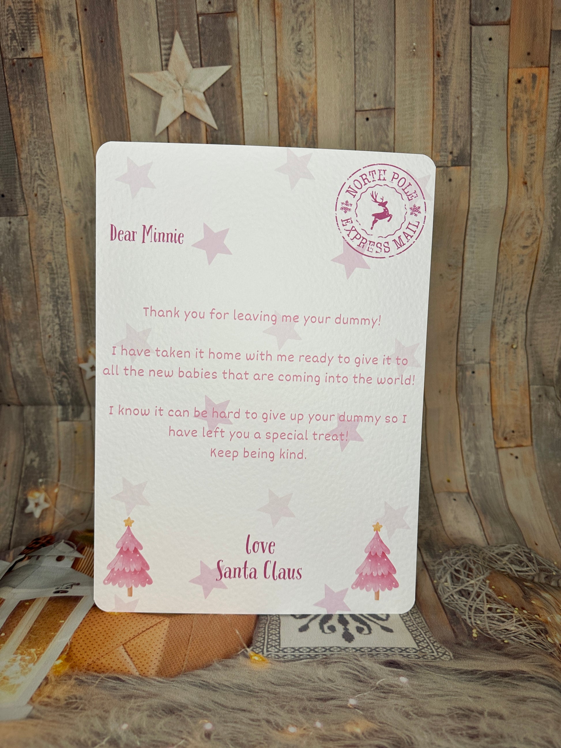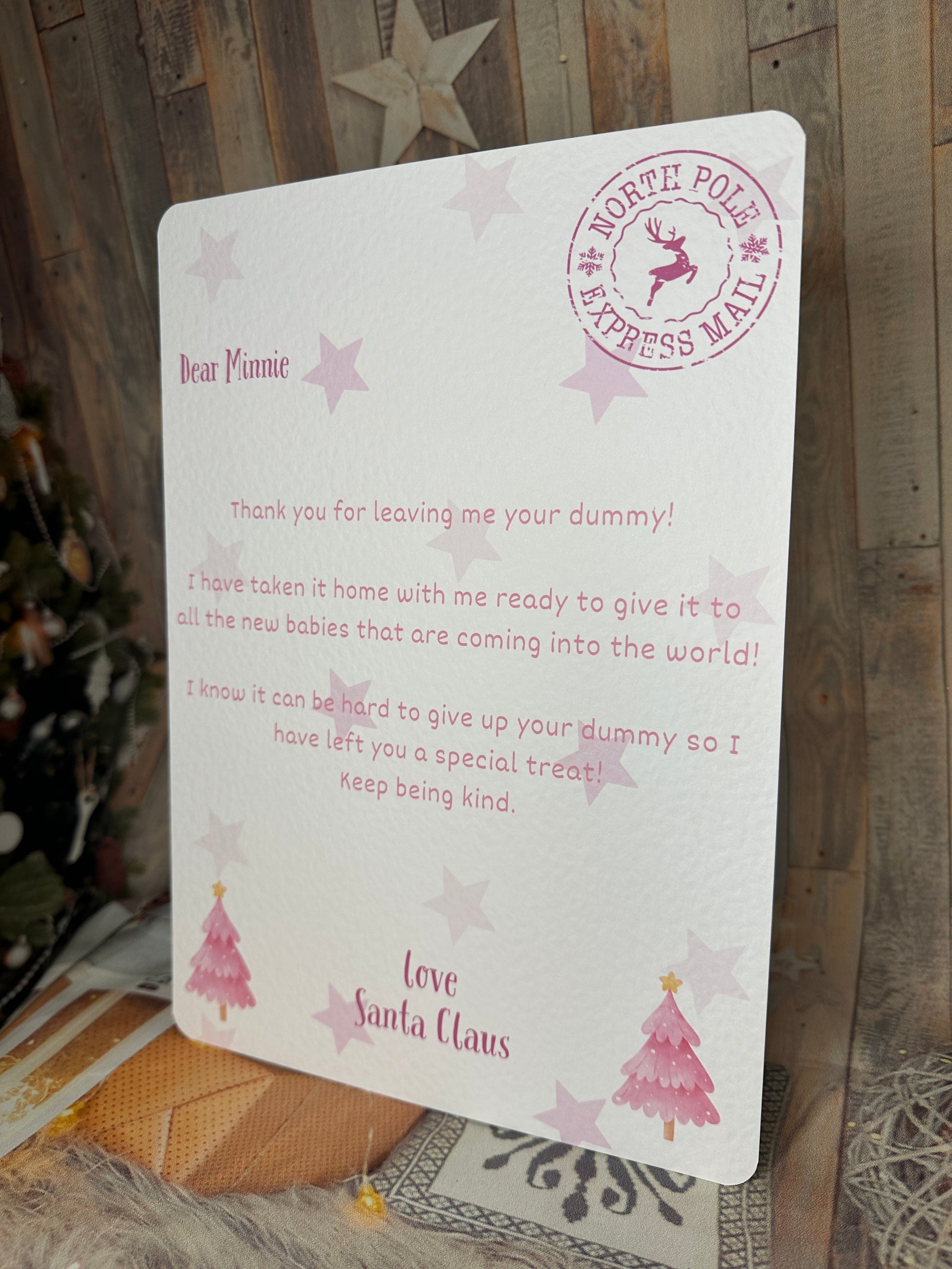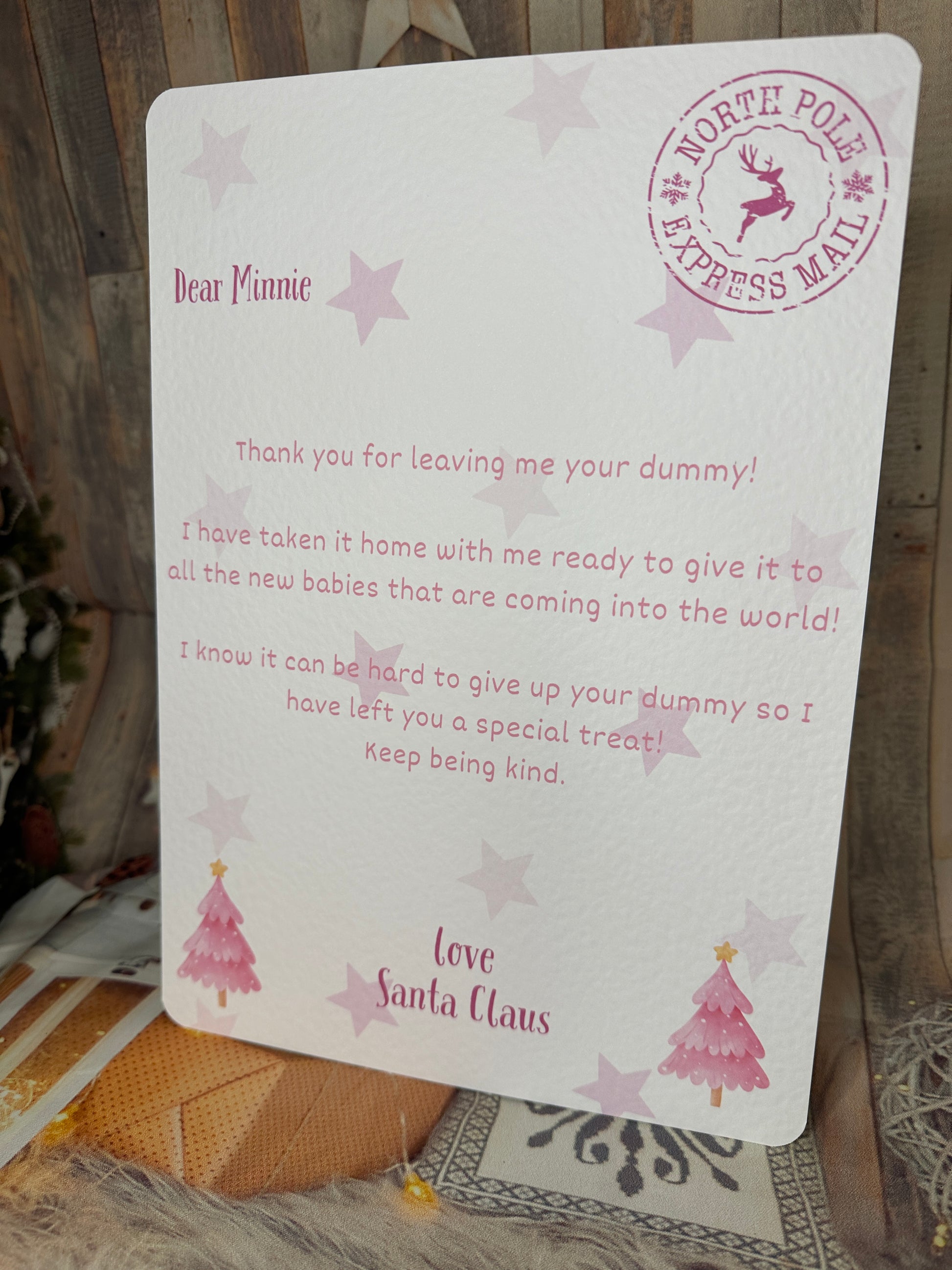 Letter from Santa thanking the child for leaving them their dummy. Please pop the childs name in the personalisation box.