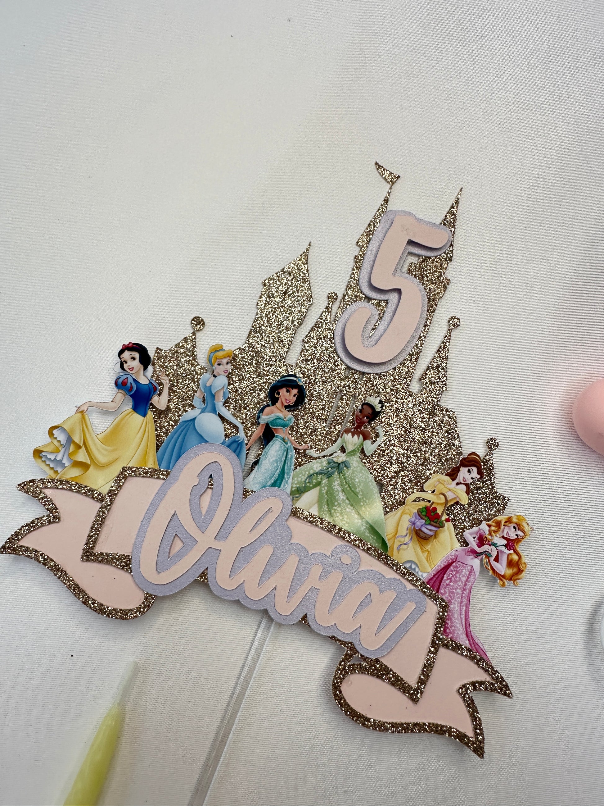 Princess Cake Topper with Rose Gold Glittery Castle and 6 Disney Princesses.