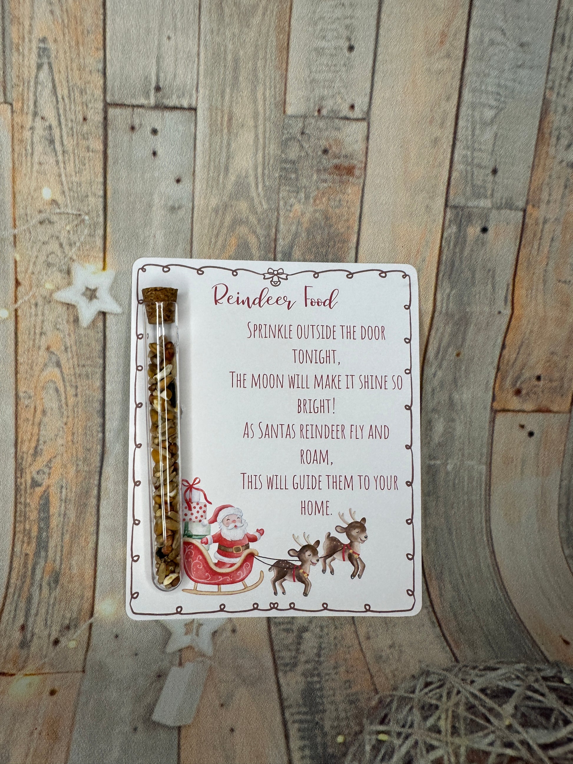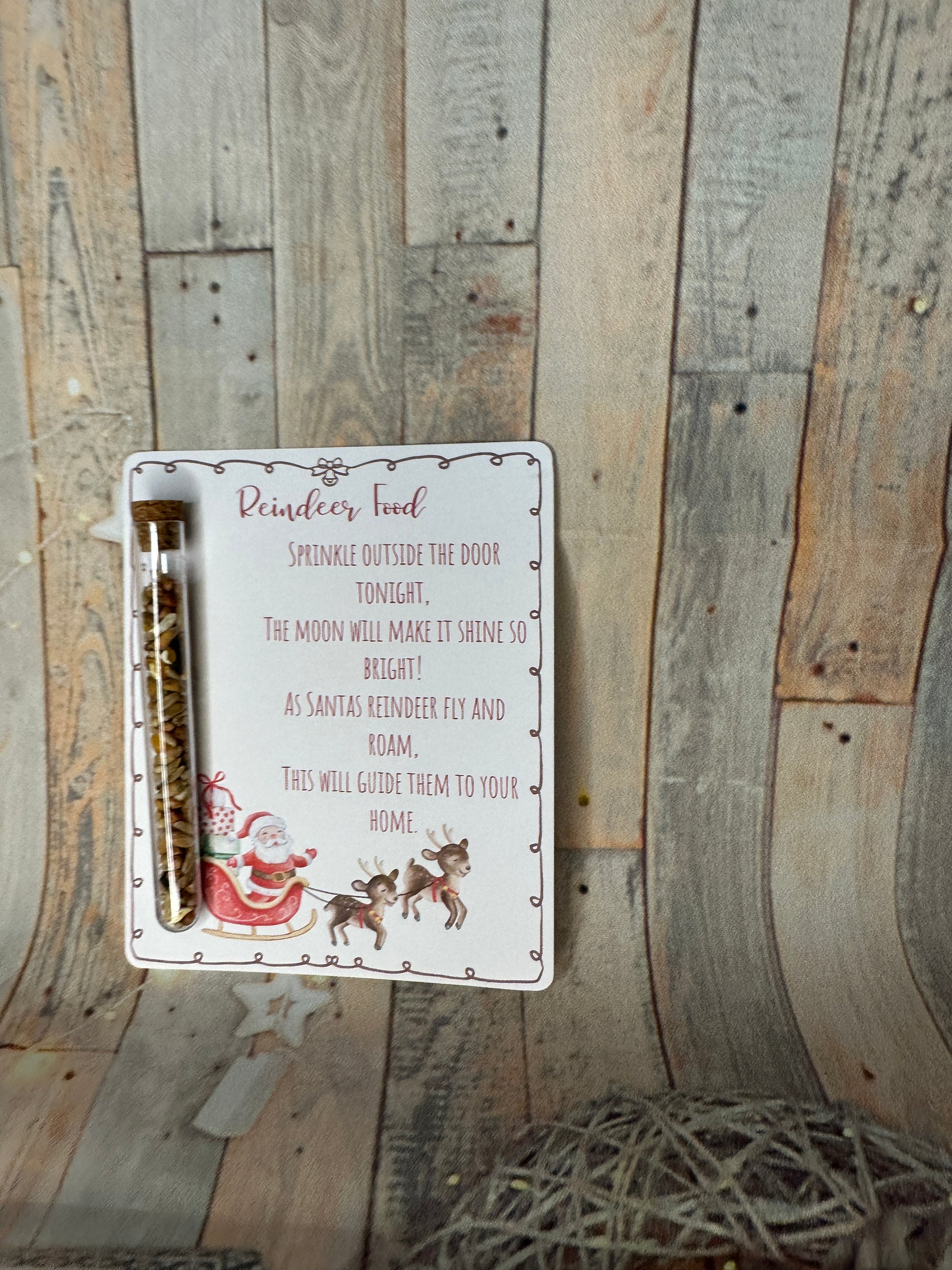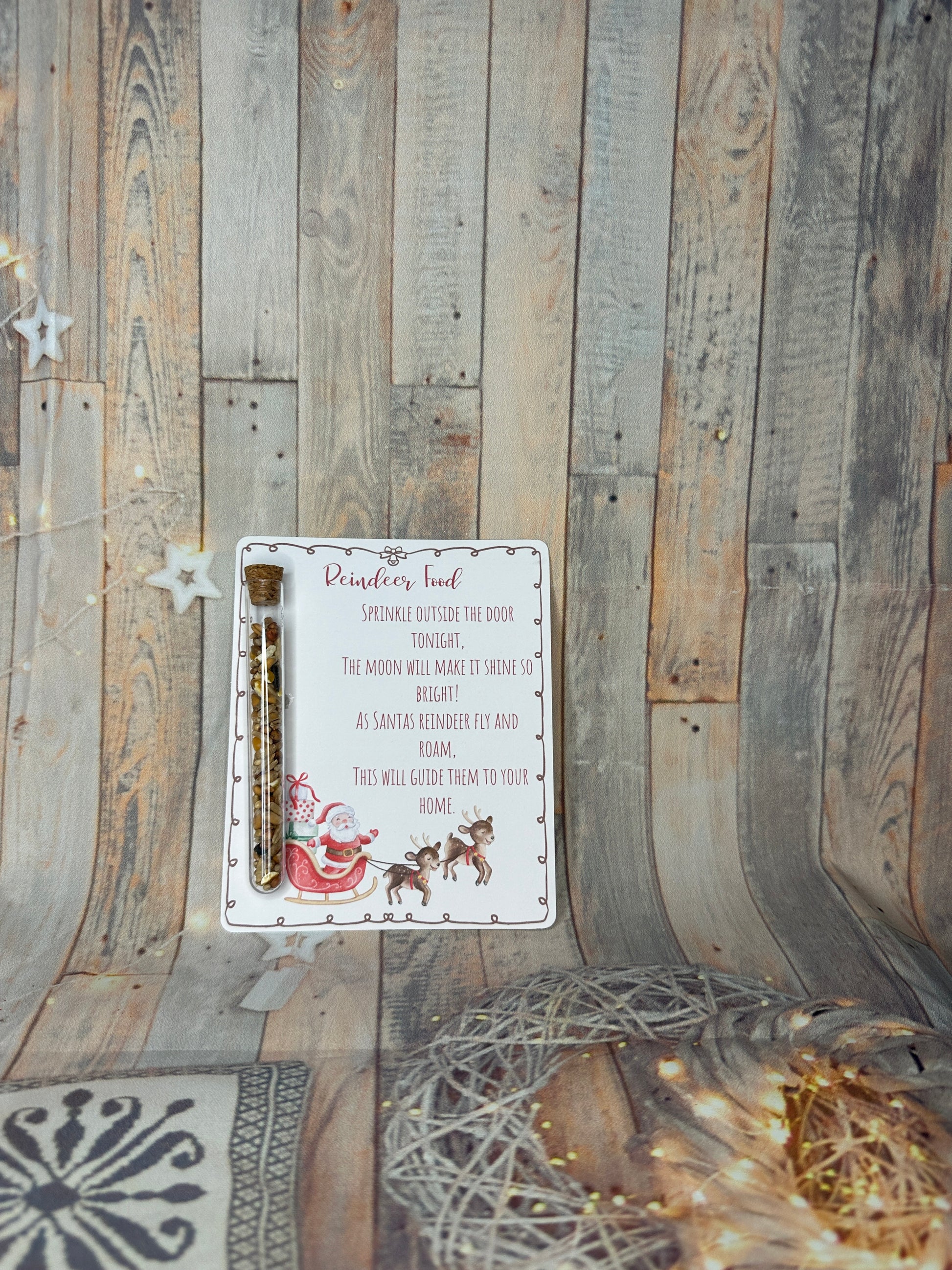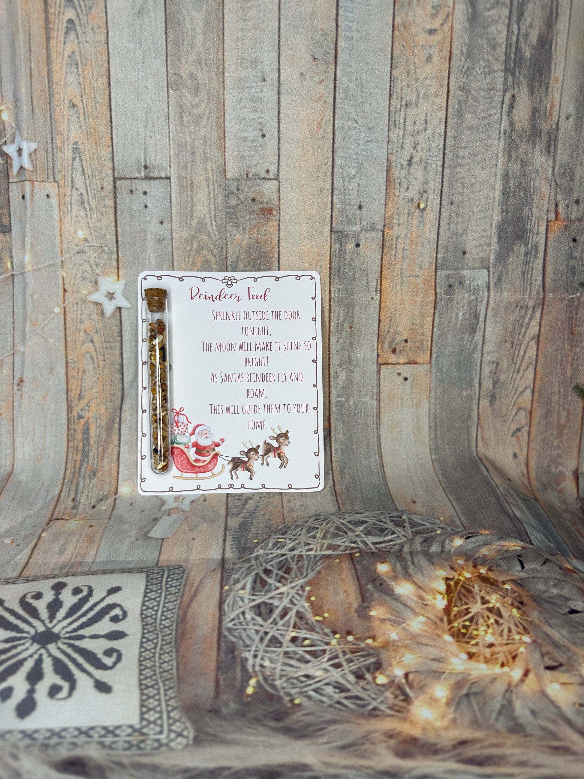1 small tube of reindeer food backed onto a 300gsm matte card with small Christmas poem.