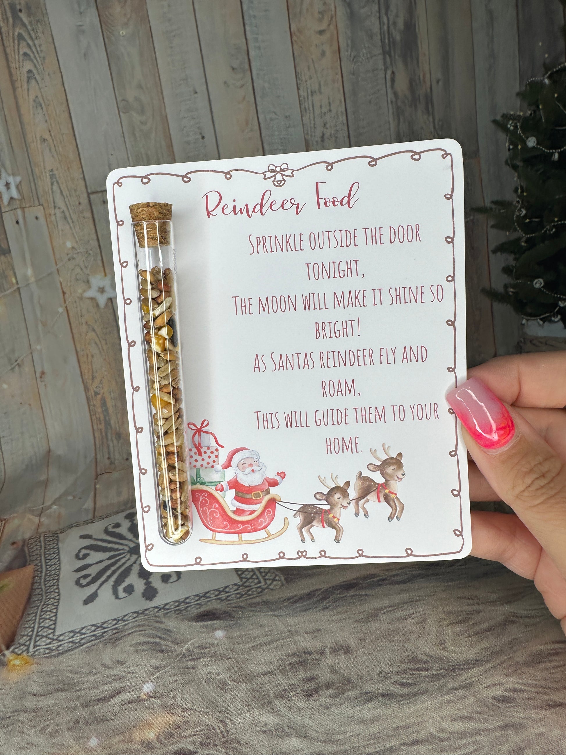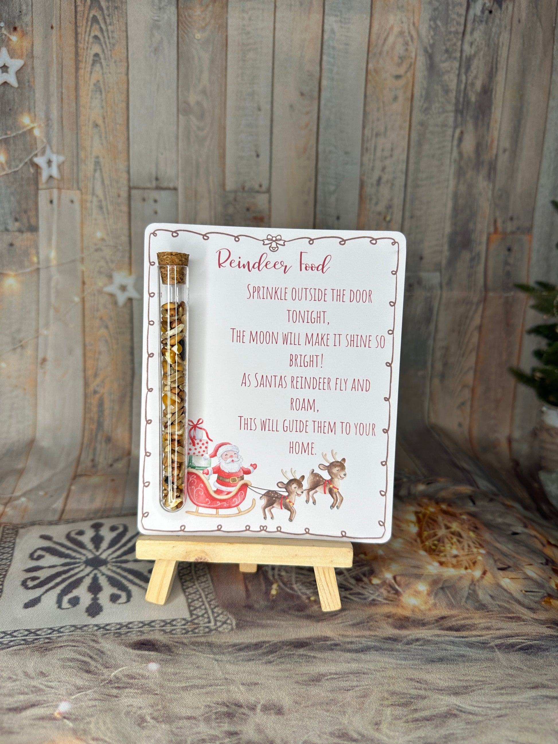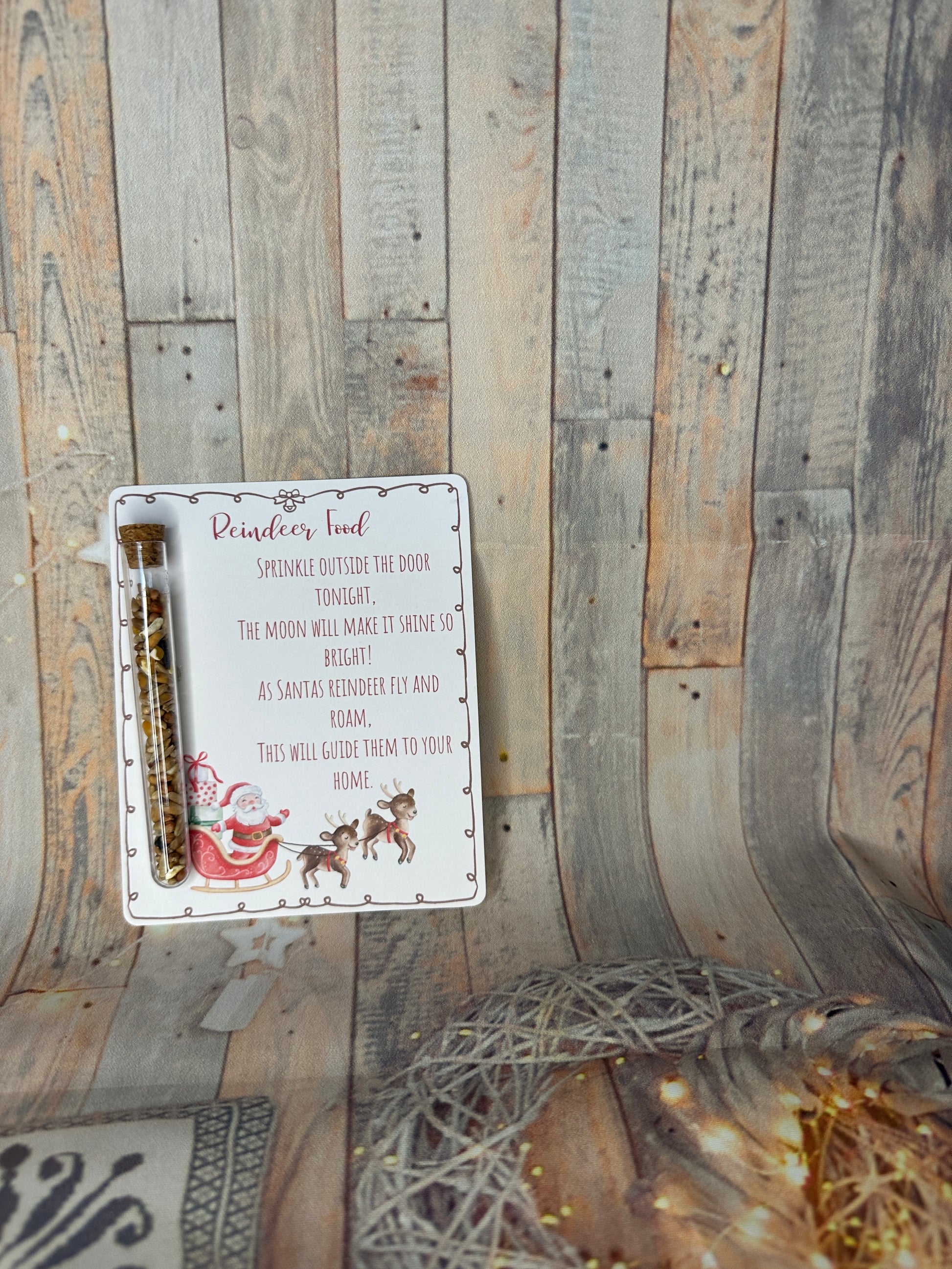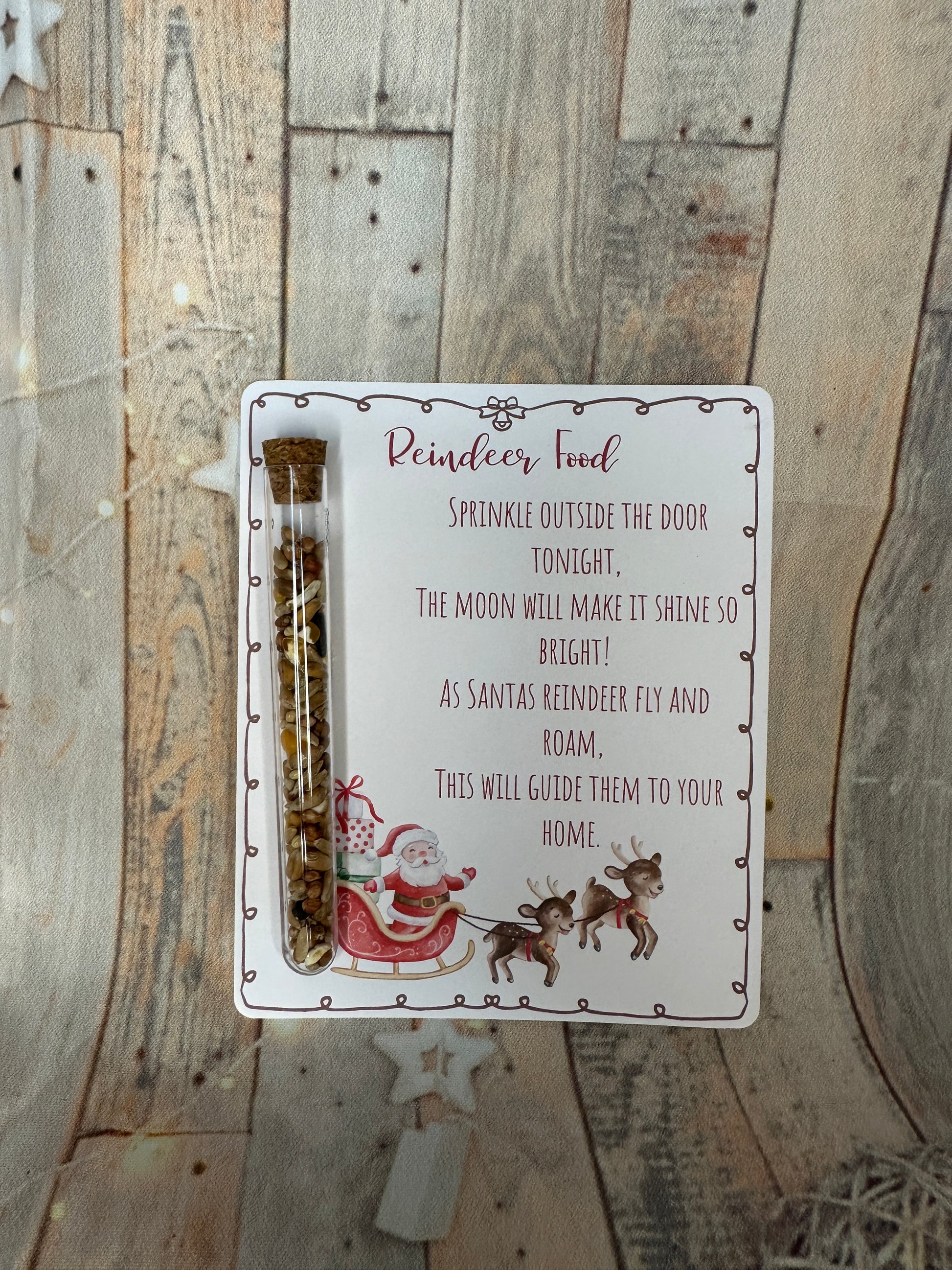 1 small tube of reindeer food backed onto a 300gsm matte card with small Christmas poem.