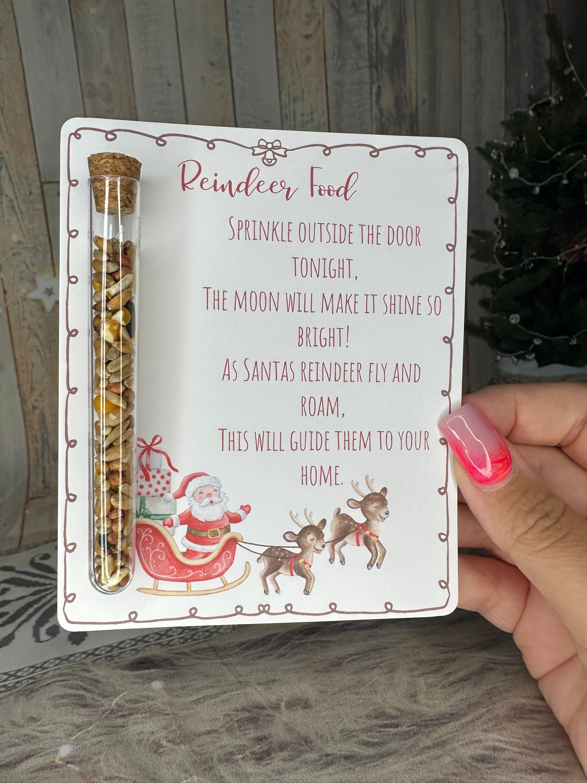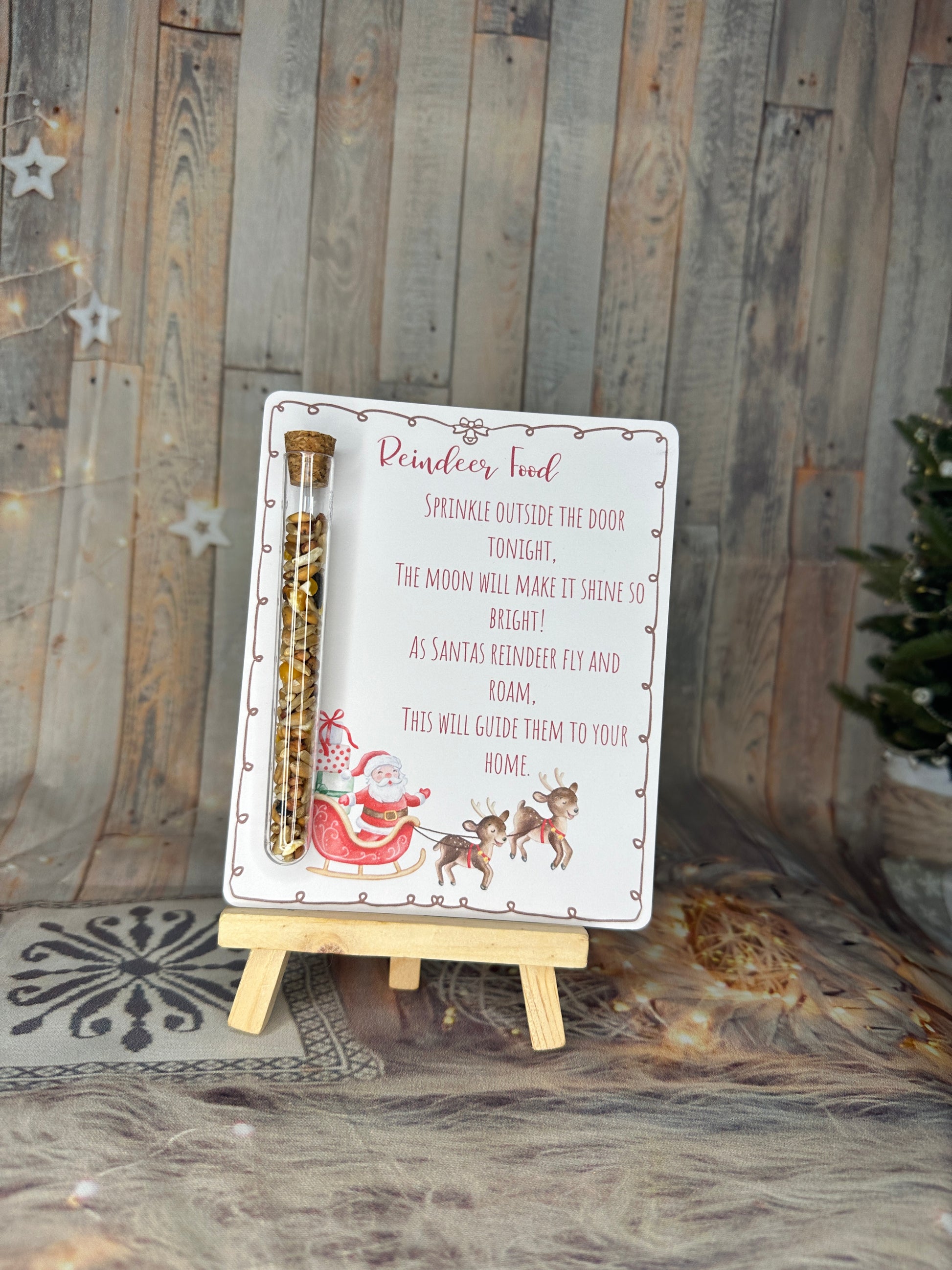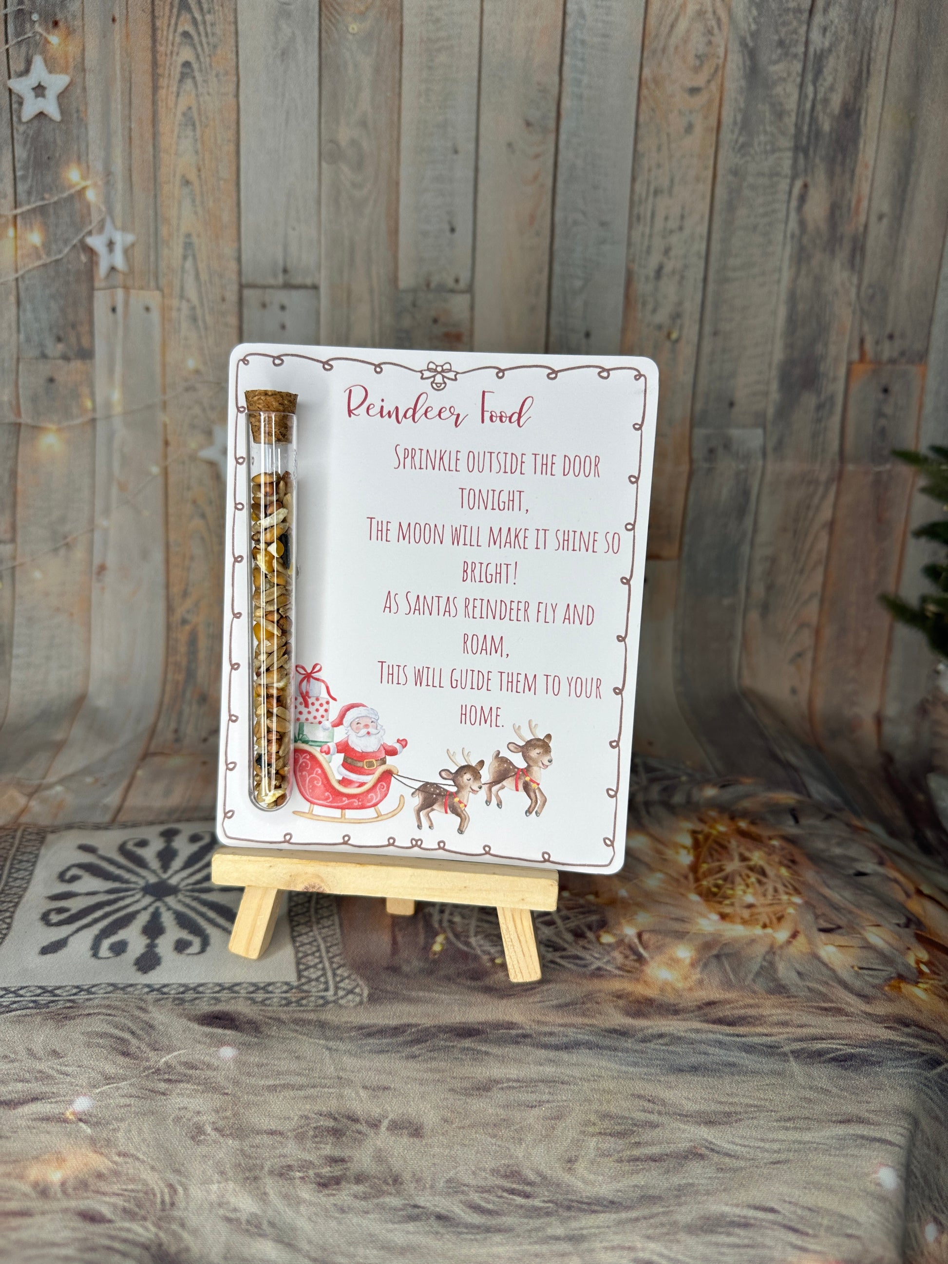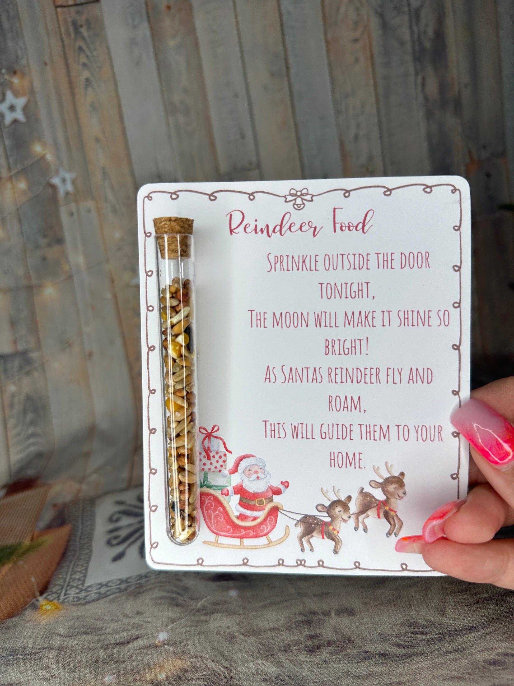 1 small tube of reindeer food backed onto a 300gsm matte card with small Christmas poem.