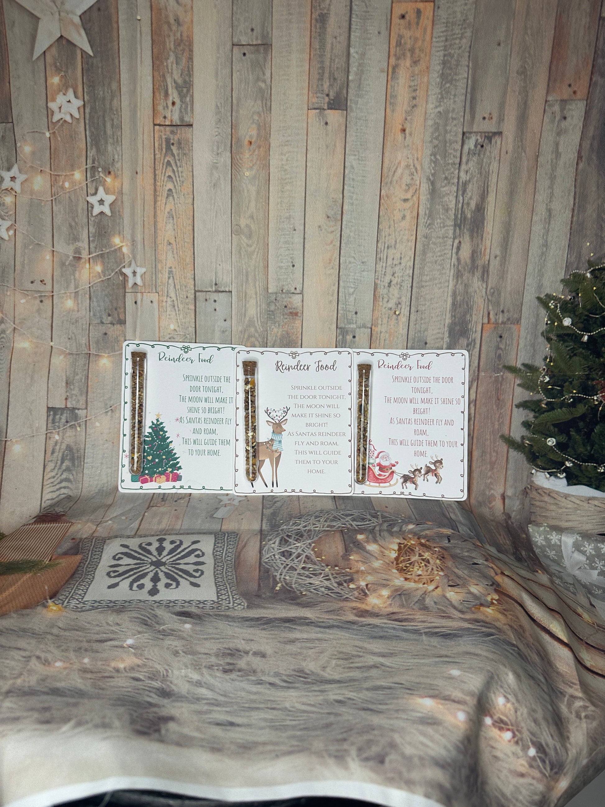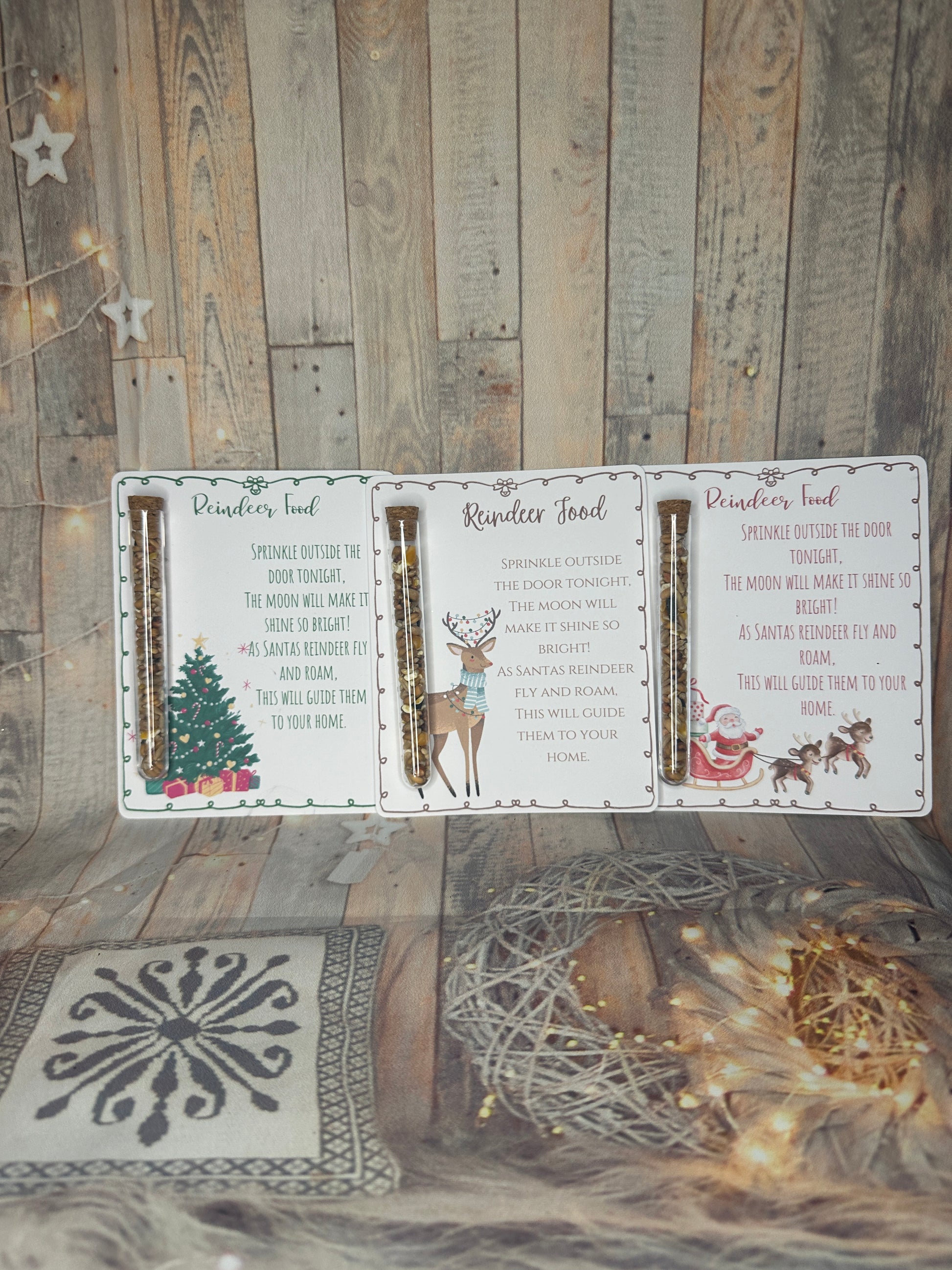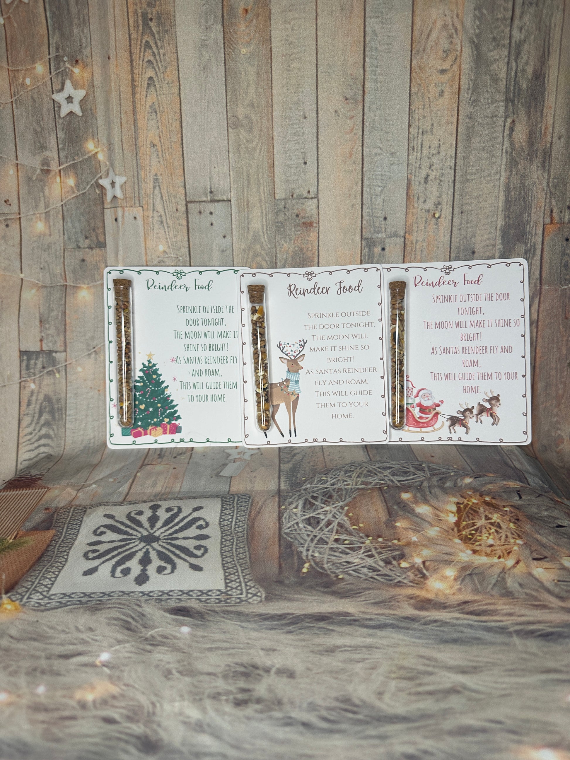 1 small tube of reindeer food backed onto a 300gsm matte card with small Christmas poem.