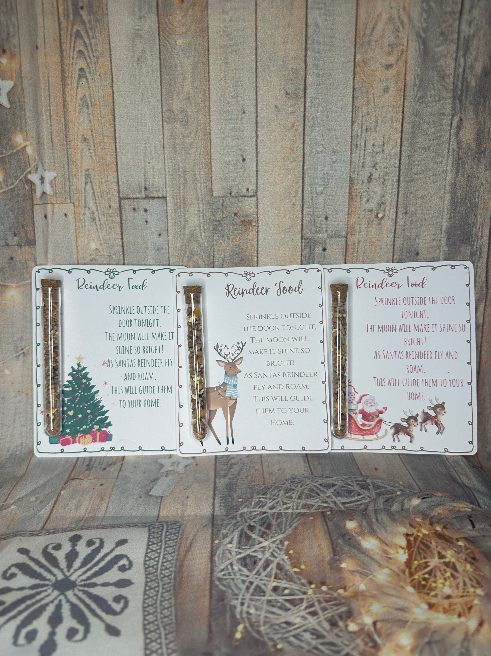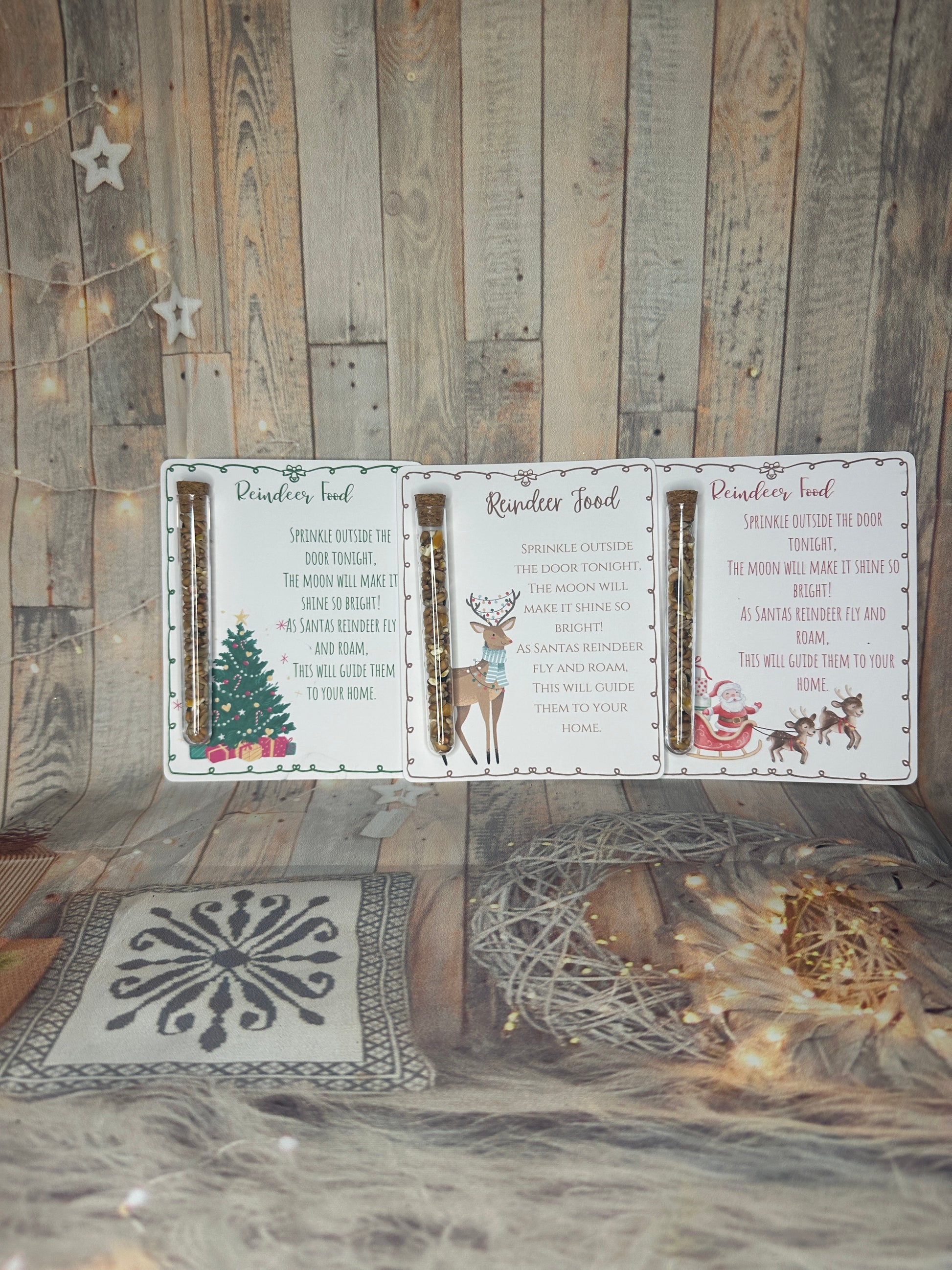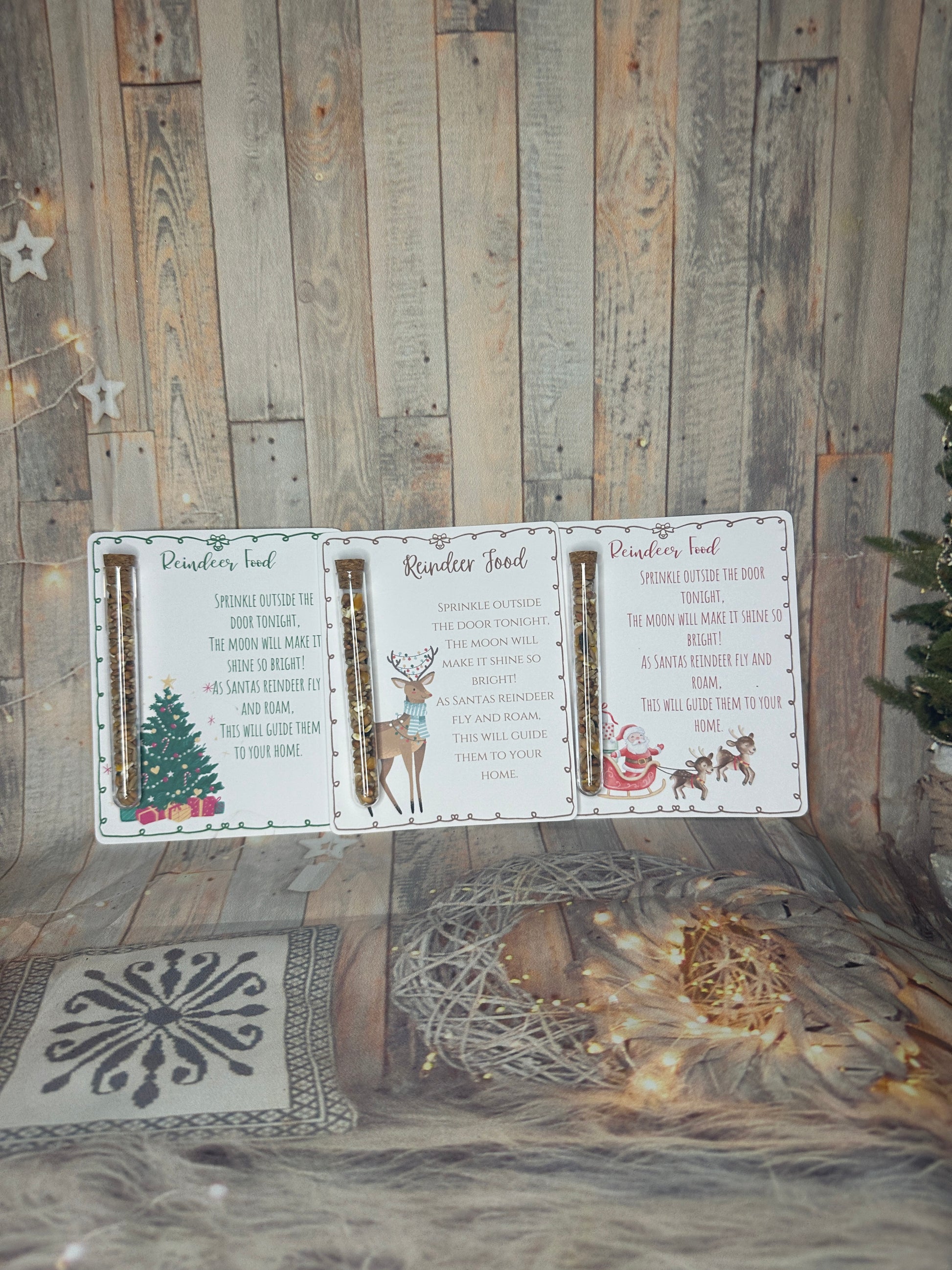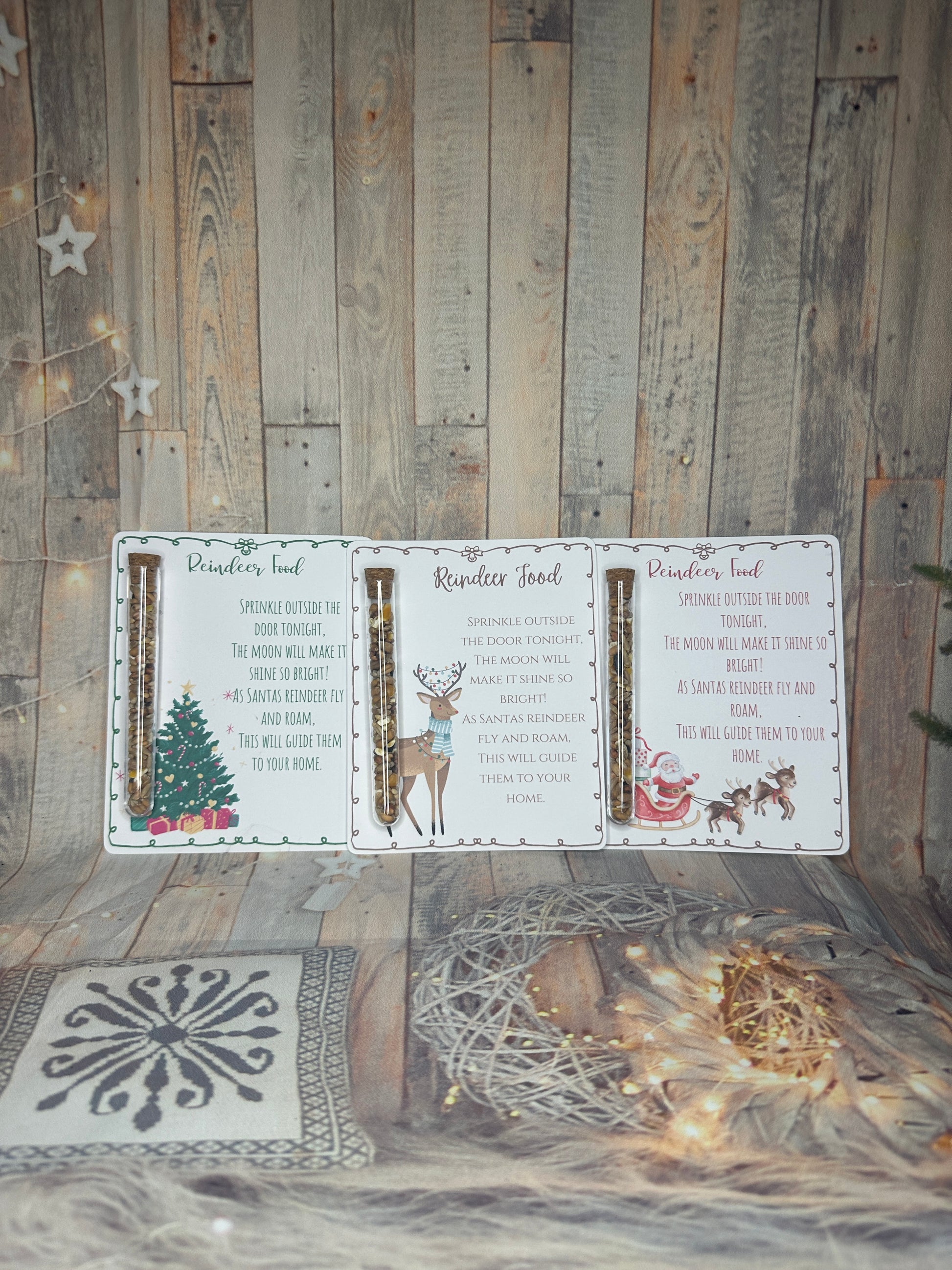 1 small tube of reindeer food backed onto a 300gsm matte card with small Christmas poem.