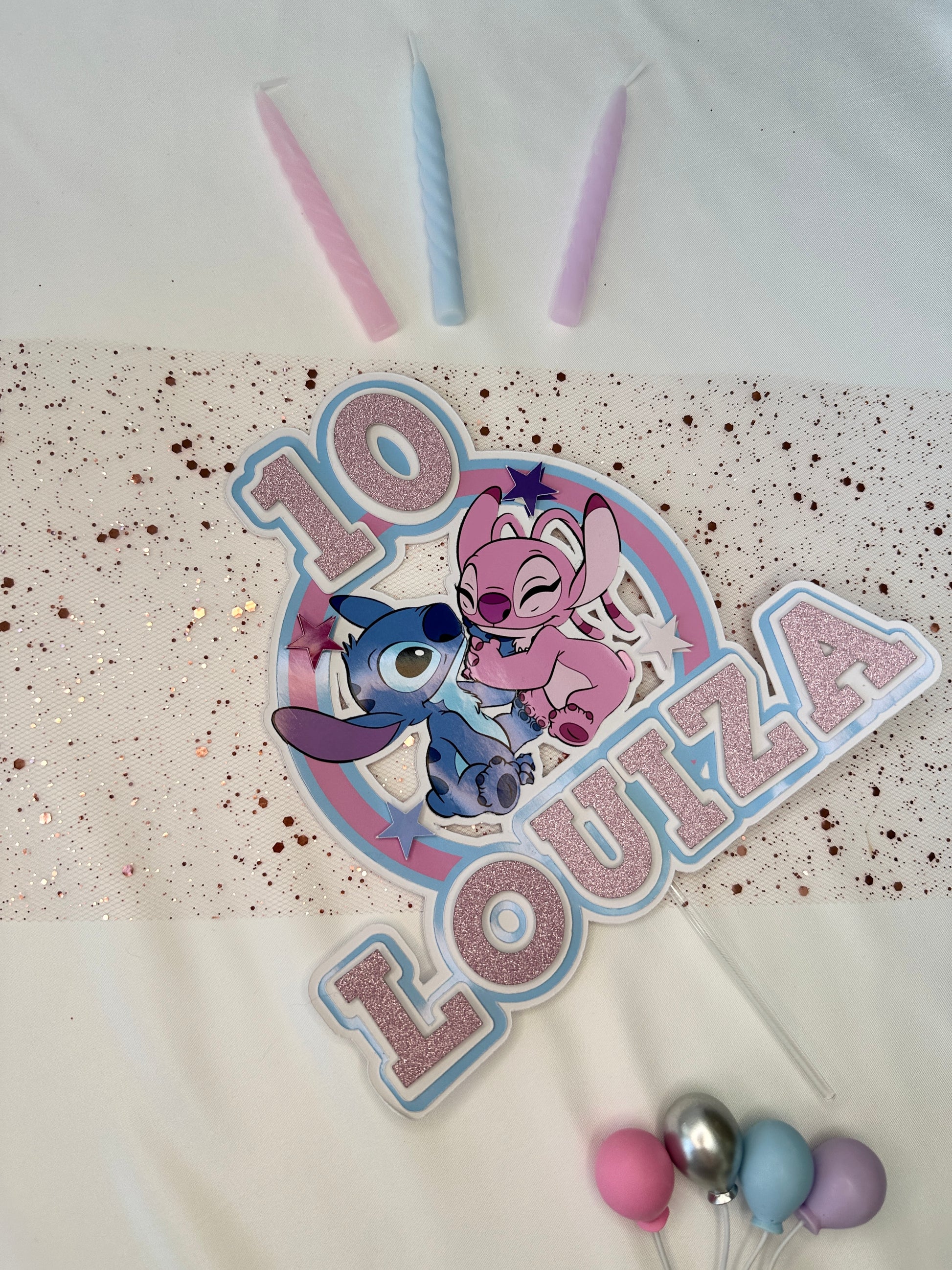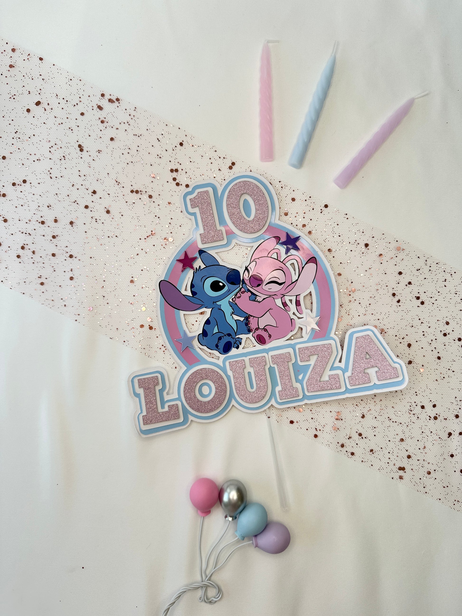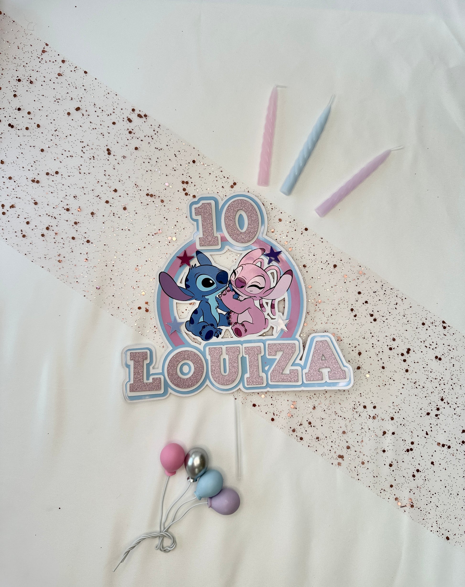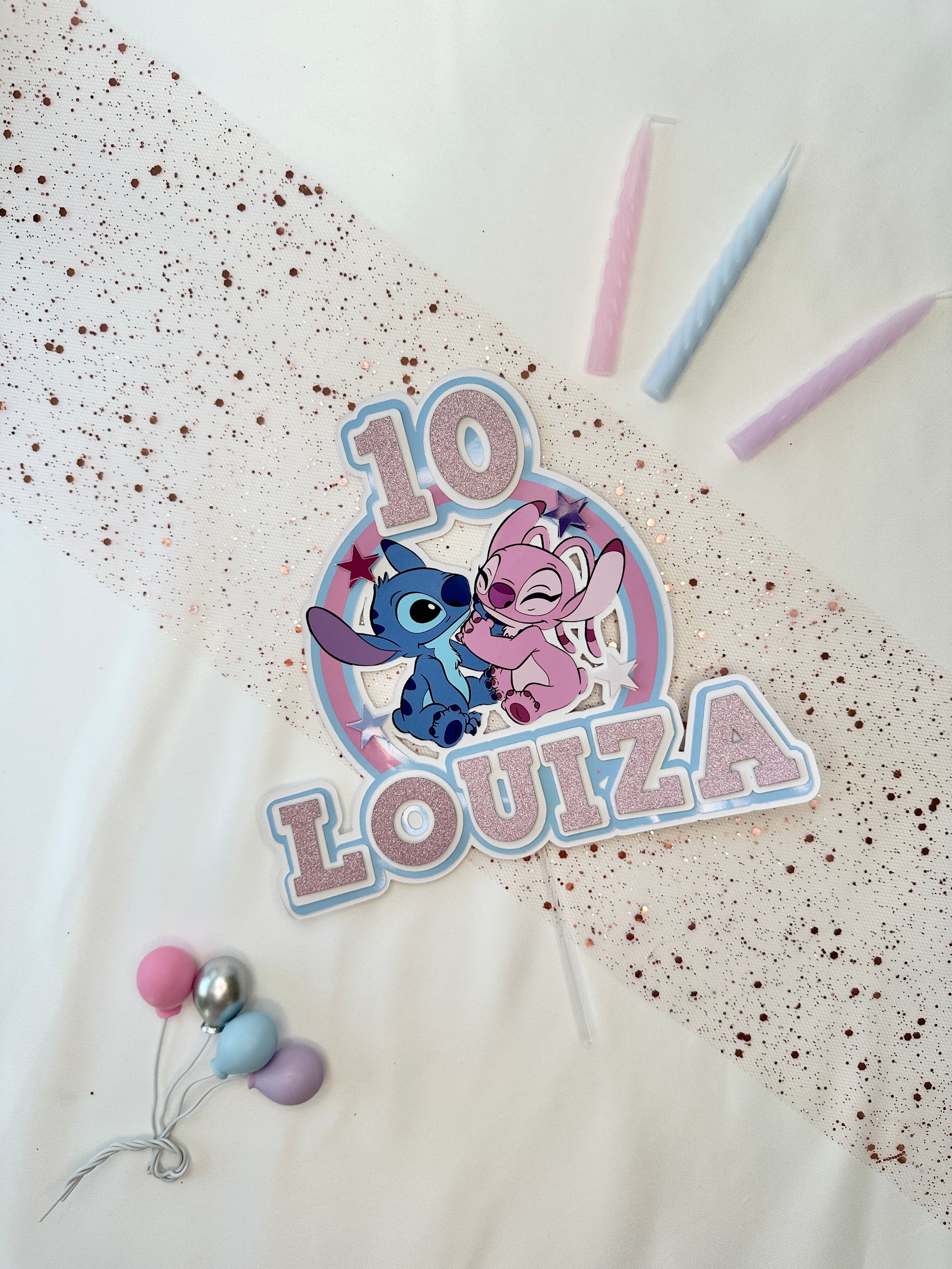 Stitch and Angel Cake Topper, Personalised with Name and Age